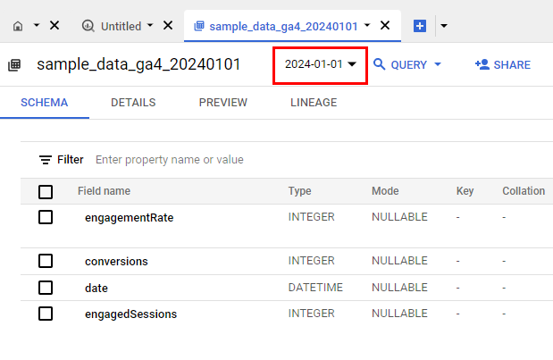 Our exports to BigQuery are partitioned by date. Exports that span less than 60 days will be partitioned by day. In Google Cloud console, the daily partitions are visible under the Filter dropdown next to the table name.