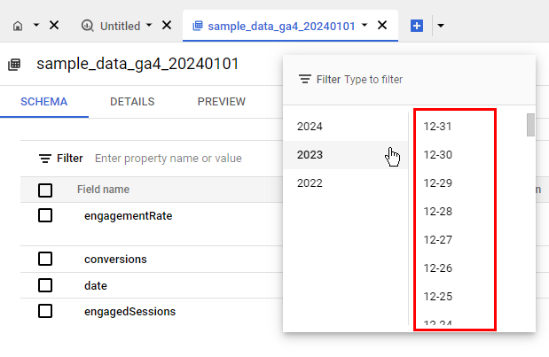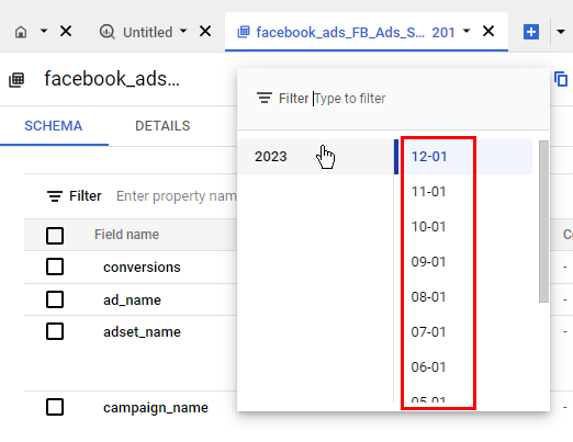 Exports spanning 60 days or more will be partitioned by month. In Google Cloud console, monthly partitions are visible under the Filter dropdown next to the table name.