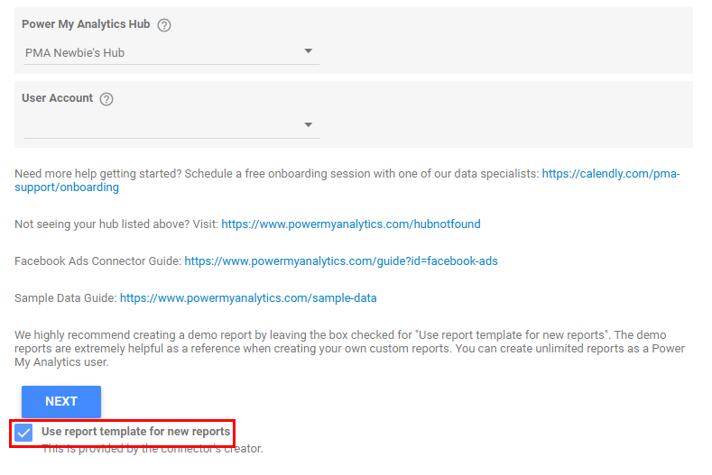 - Follow the steps in Facebook Ads Data Connector User Guide > Creating a Looker Studio Report to create your Facebook Ads report in the Looker Studio application. Make sure to leave "Use report template for new reports" checked when creating the report.