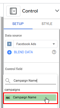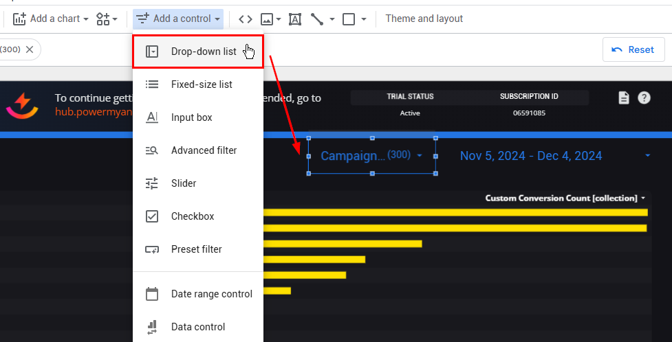 To report your custom conversions by campaign, add a dropdown control to your Looker Studio report: