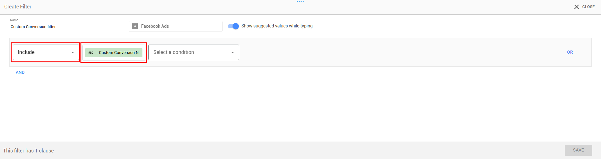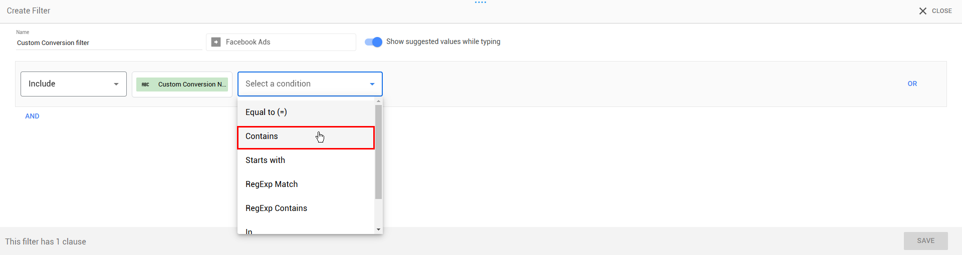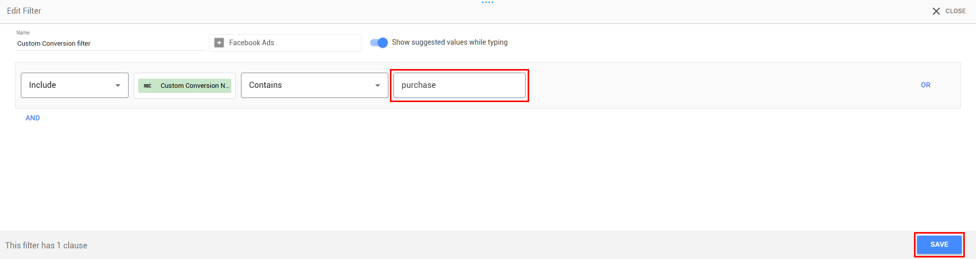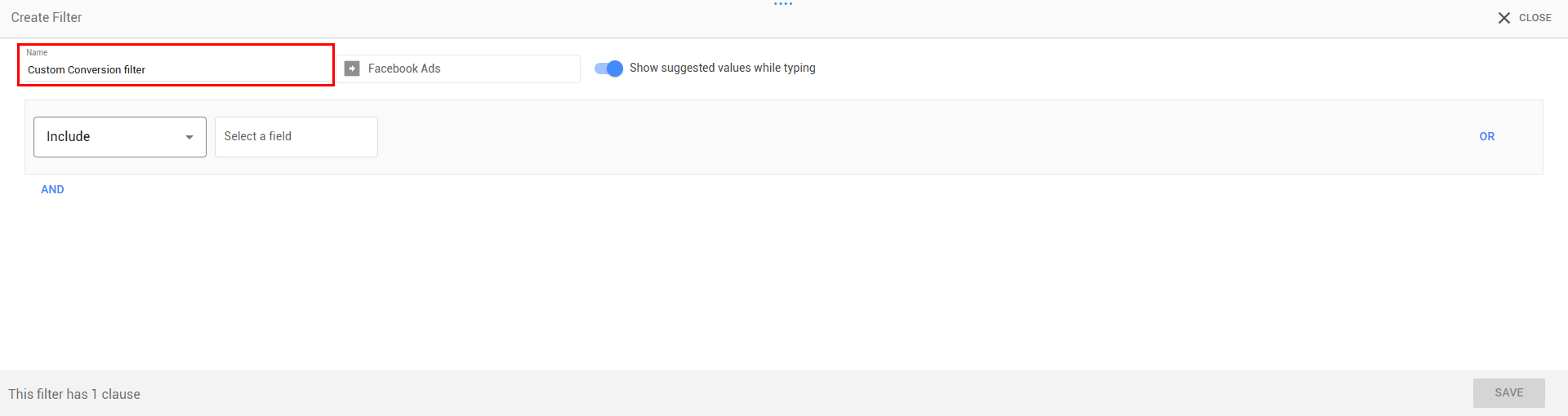 - Under Name, enter a name for your filter such as "Custom Conversion filter".