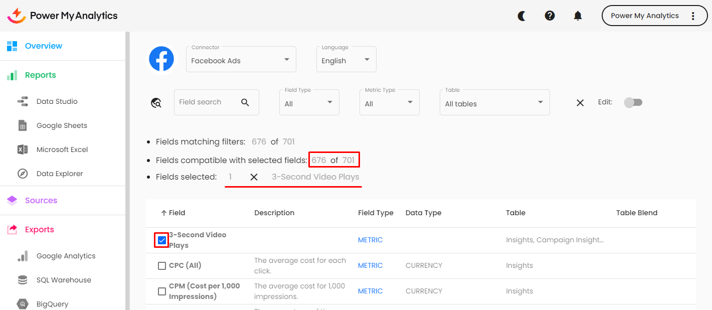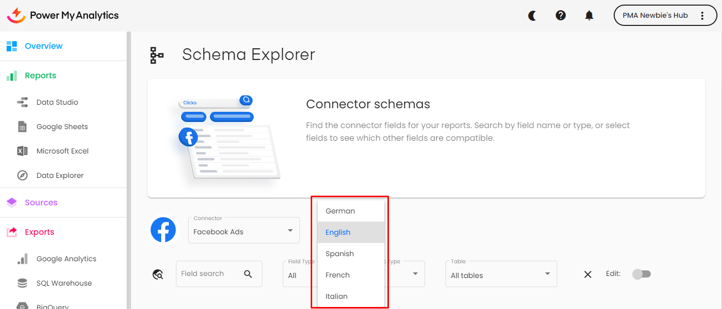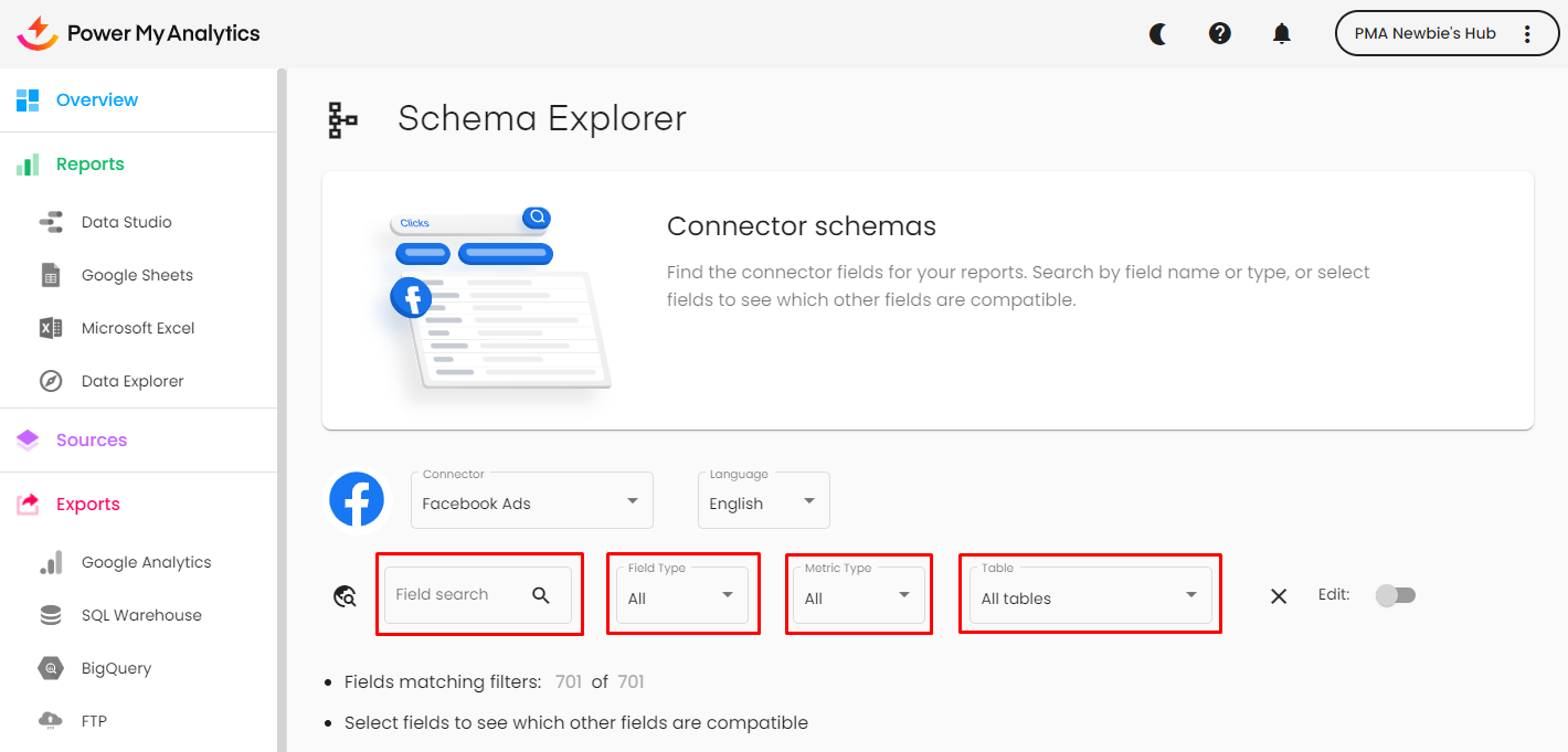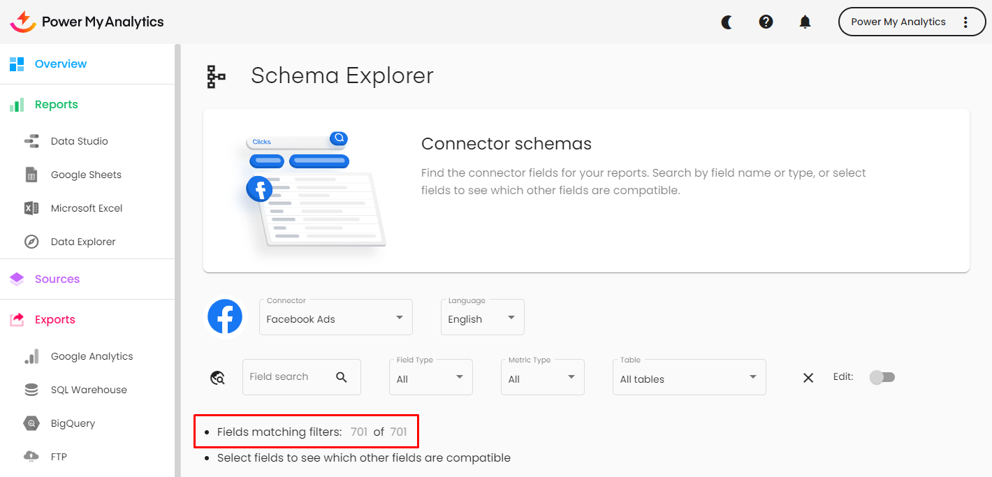 The PMA Schema Explorer is an easy way to find metrics and dimensions that are available for your connectors and identify any possible conflicts or errors. Schema Explorer can find additional fields that are compatible with your selected fields and available in the same tables. This can help you avoid mix-and-match errors when creating reports in Looker Studio.