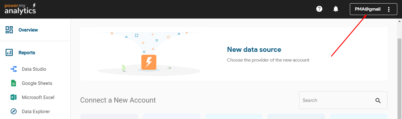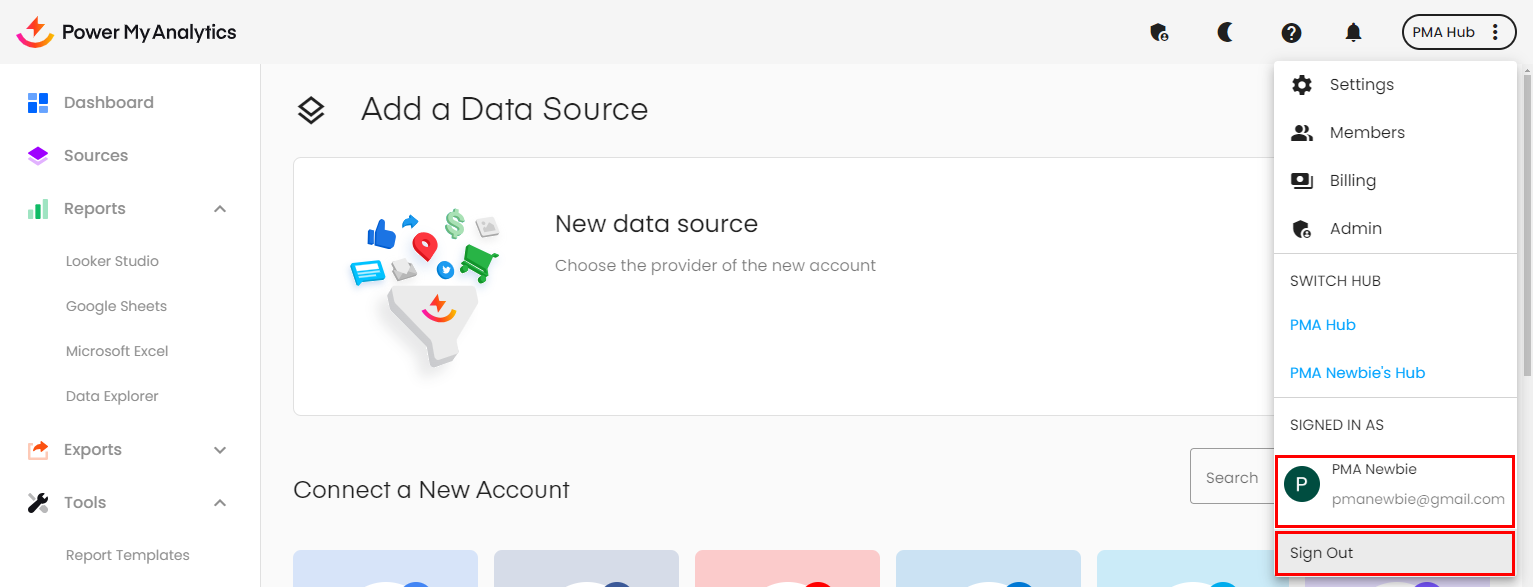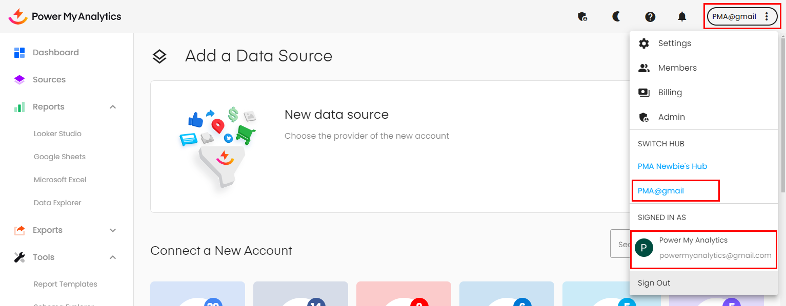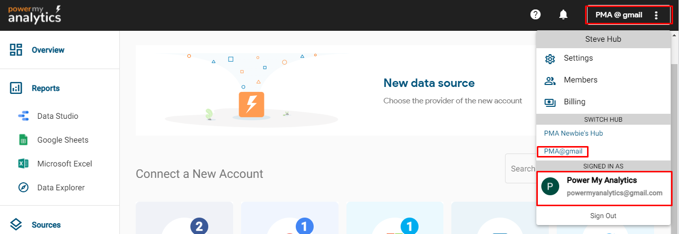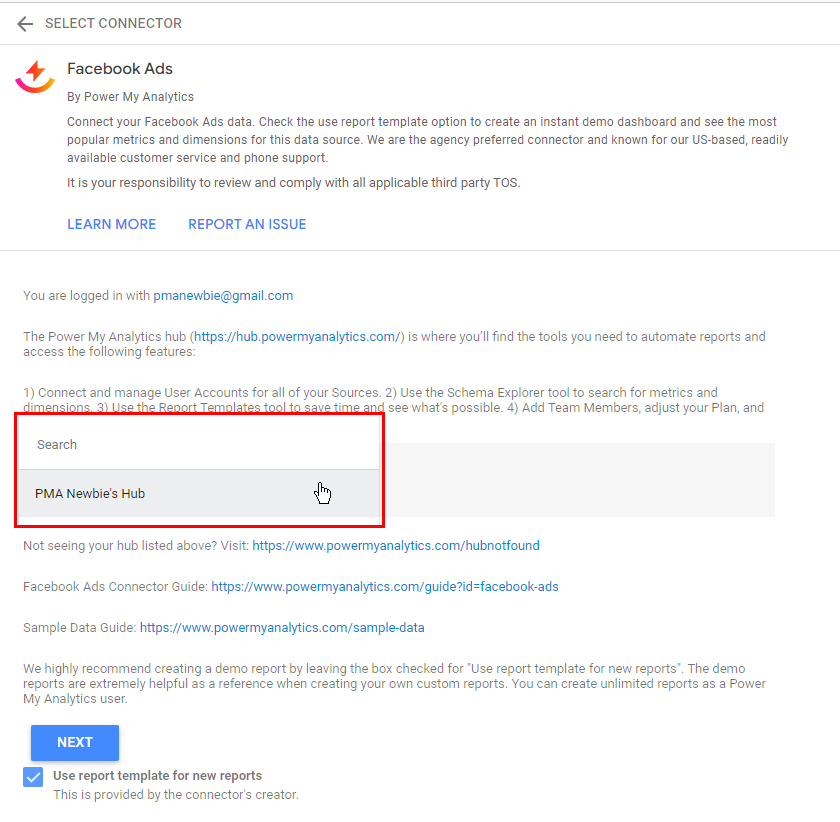 Your Hub (in this example, PMA@gmail) is not available in the drop down list when creating a Looker Studio report.