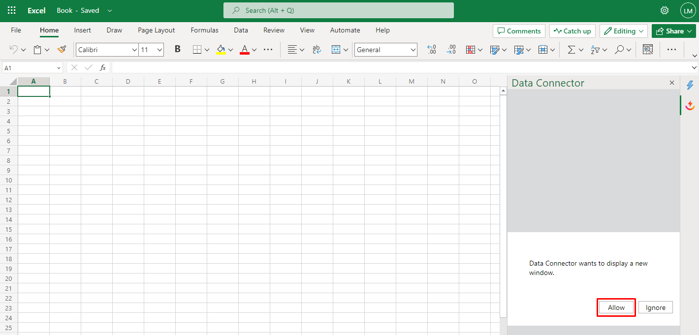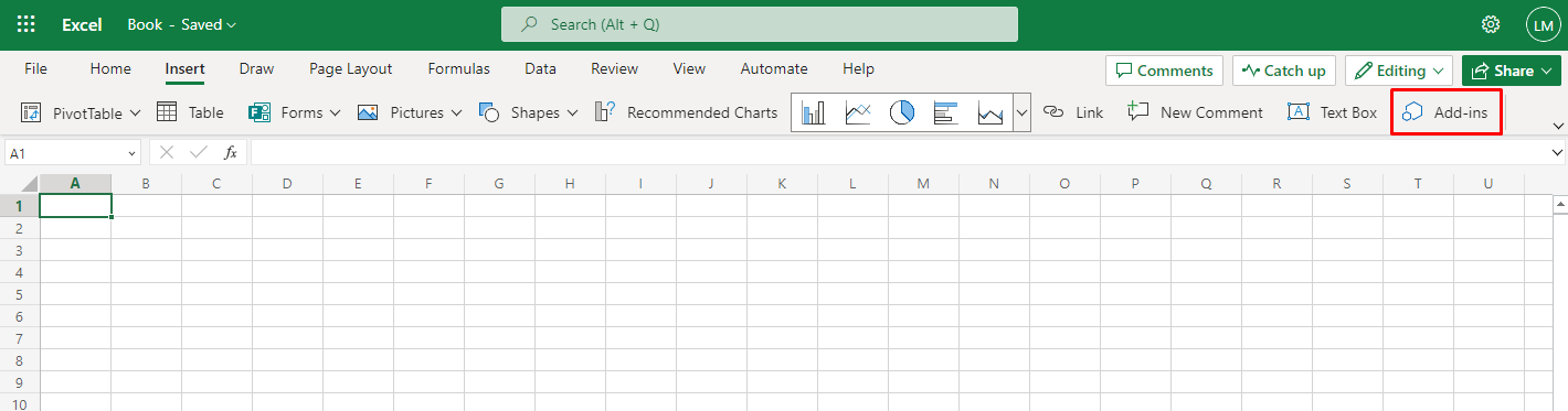 - Open a new Microsoft Excel spreadsheet, then navigate to Insert and click the Add-ins button.
