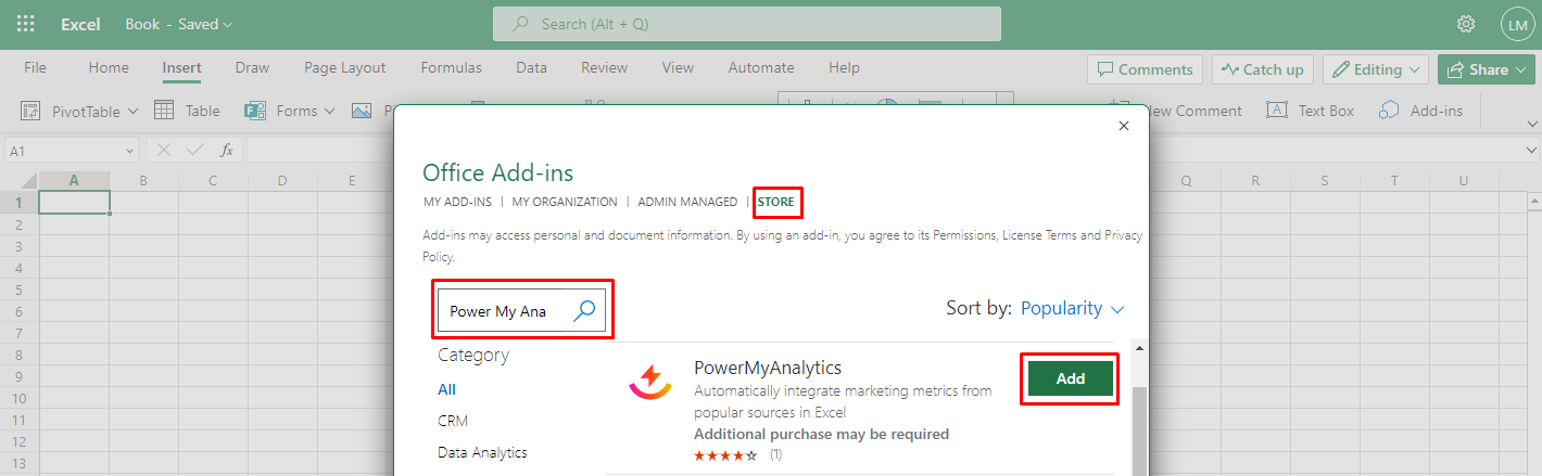 - Click Store and search for "Power My Analytics," then click the Add button.