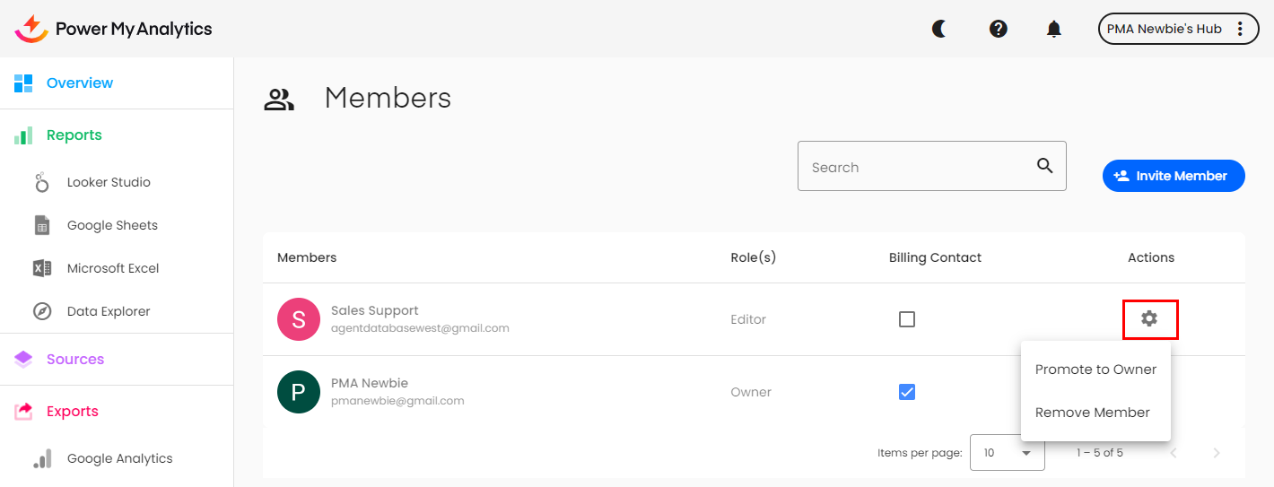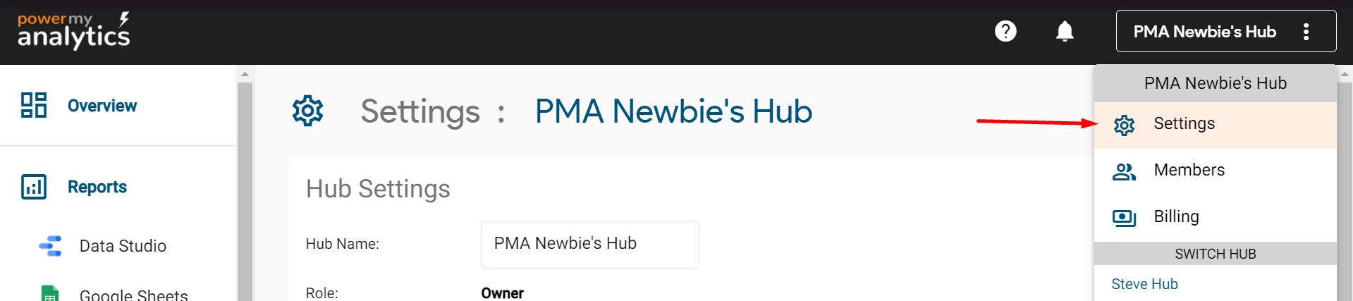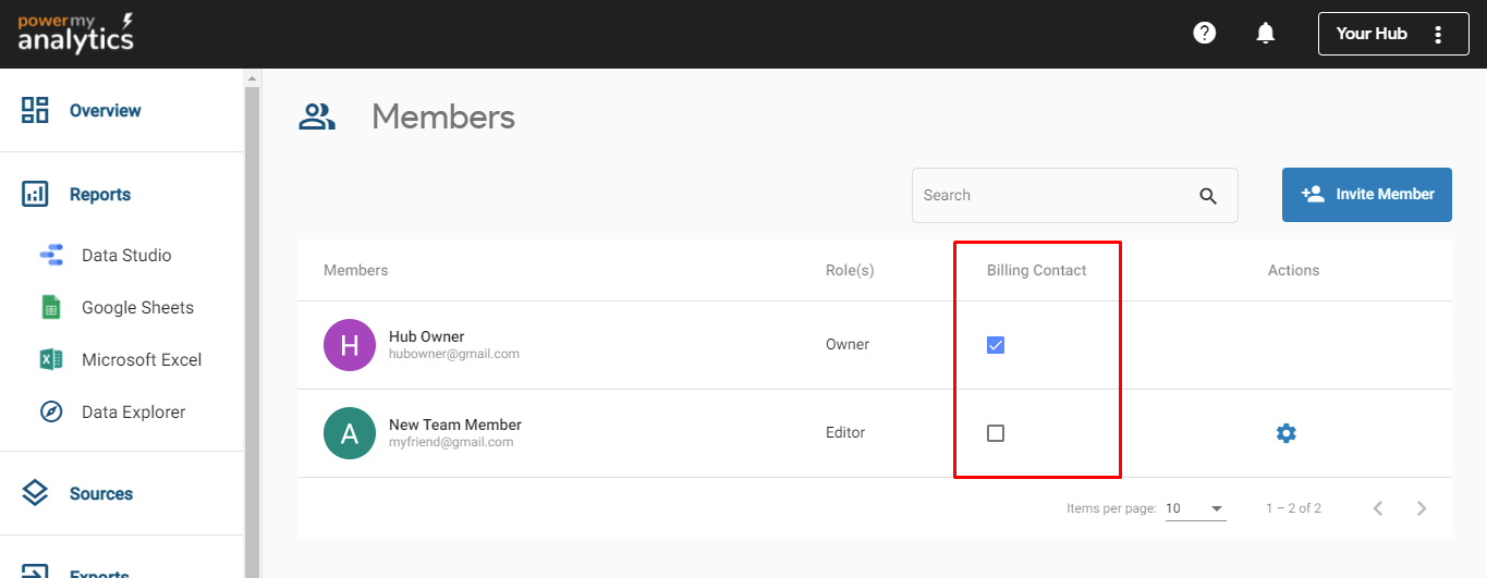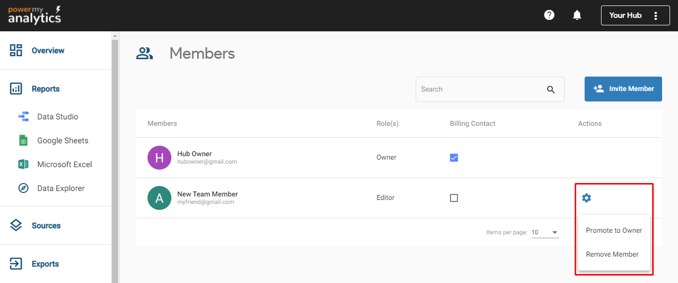 As a Hub owner, you may want to add team members as editors or billing managers to delegate roles and provide access. This article will show you where to find the tools you need to manage your team. Team members are users who authenticate and connect data source accounts to Power My Analytics. They also configure data destination integrations and have access to tools for backfilling data, managing billing, and all other account functions.