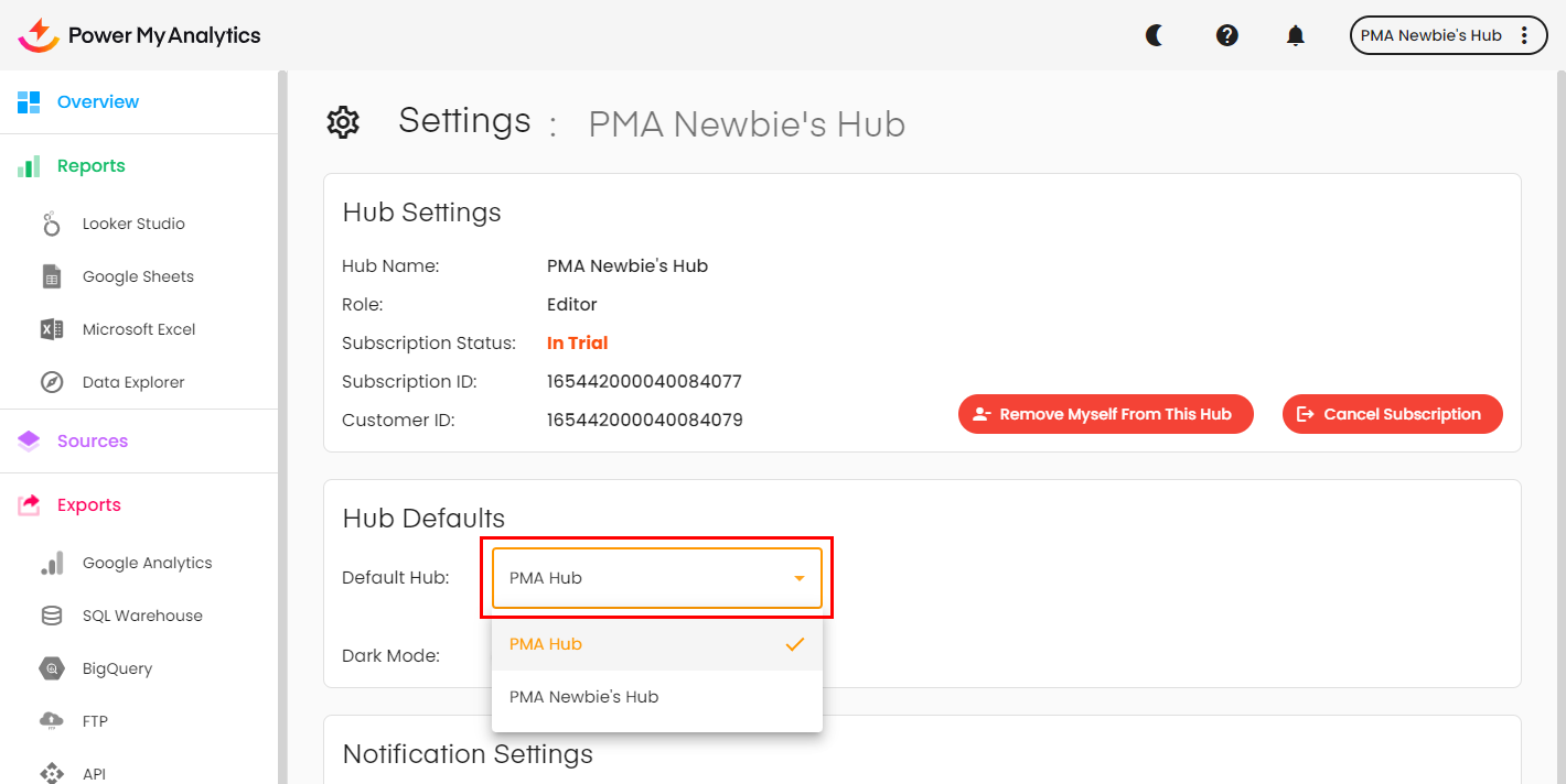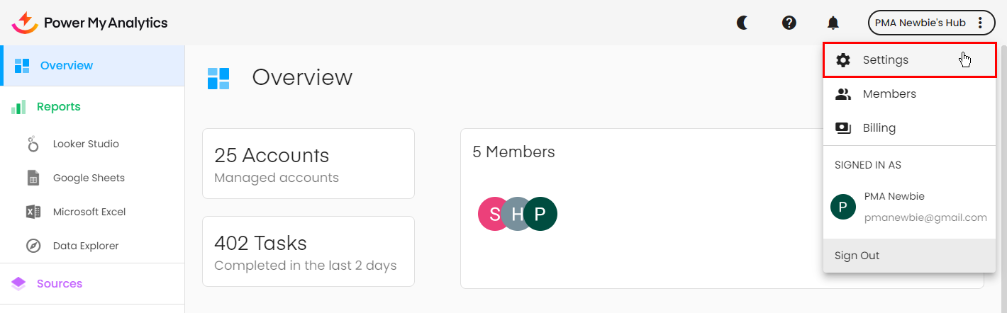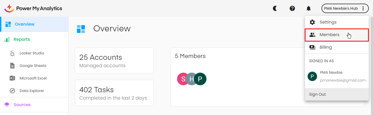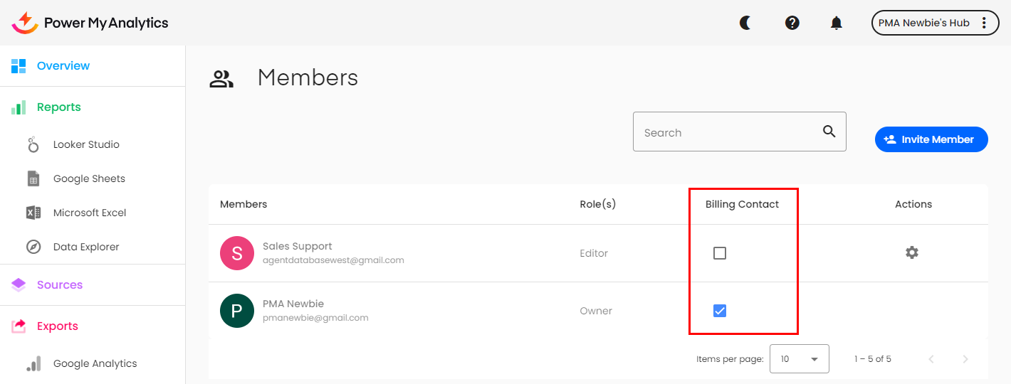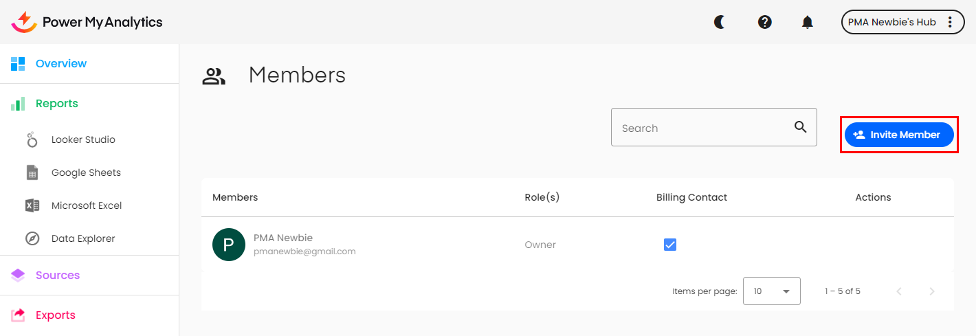 As a Hub owner, you may want to add team members as editors or billing managers to delegate roles and provide access. This article will show you where to find the tools you need to manage your team. Team members are users who authenticate and connect data source accounts to Power My Analytics. They also configure data destination integrations and have access to tools for backfilling data, managing billing, and all other account functions.