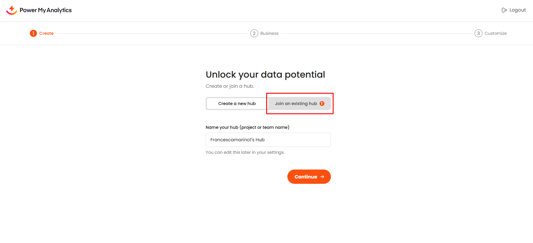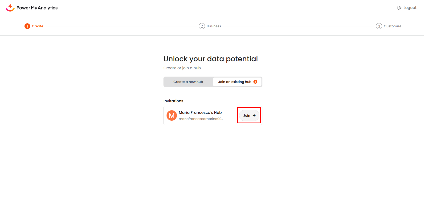 When you receive an invitation to join a Power My Analytics hub, follow these steps to accept it: