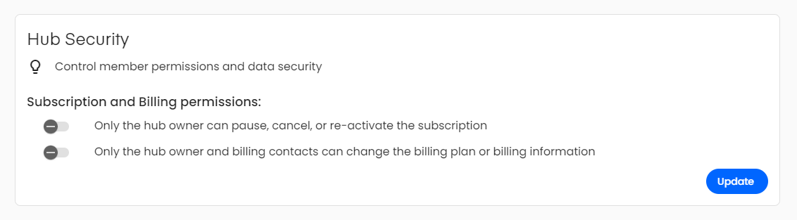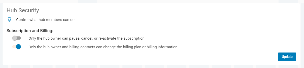 In the Hub Security section, you will find switches to toggle permissions for members of your hub. You can allow other members of your hub to have all of the same permissions an owner has, or you can limit their ability to cancel or see the billing information.