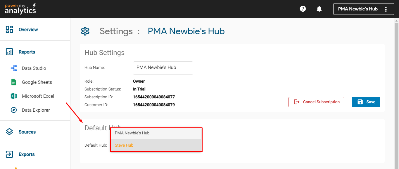 If you are an Owner or Member in many hubs, you can designate a default hub to manage them more easily.