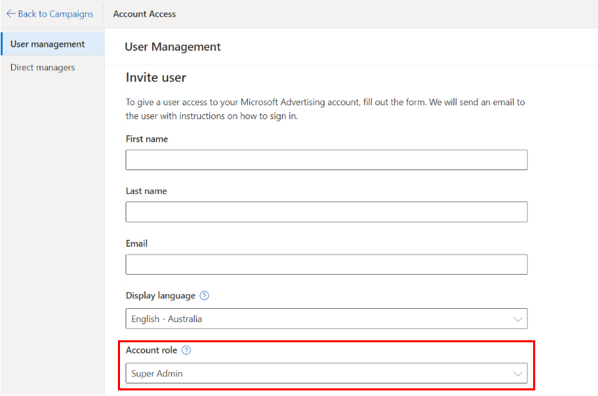 - Make sure the Account role is set to Advertiser Campaign Manager or Super Admin.