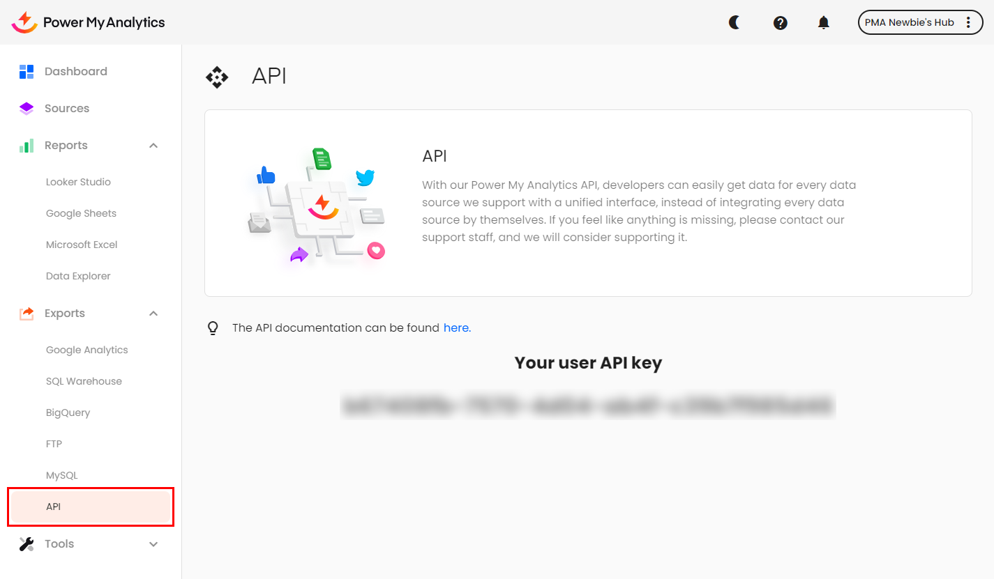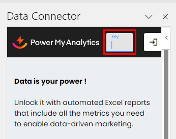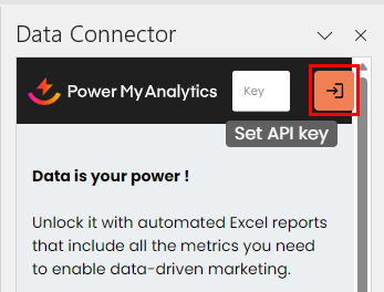 When you first use the Excel data connector, you will be prompted to enter your Power My Analytics user API key: