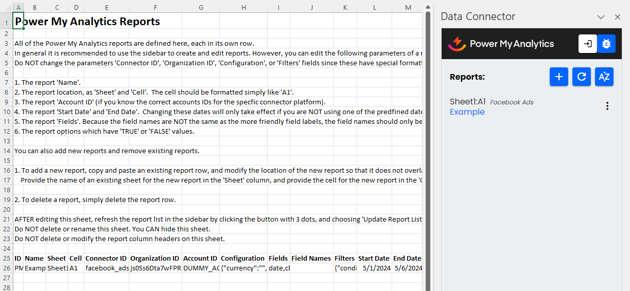 There will be a new sheet created called "PMA Config" listing all reports created and their settings.