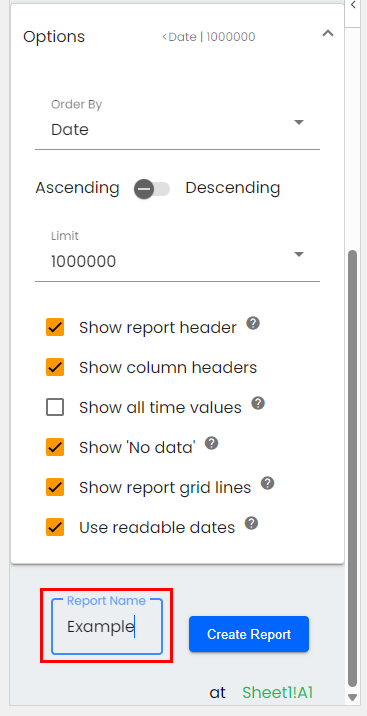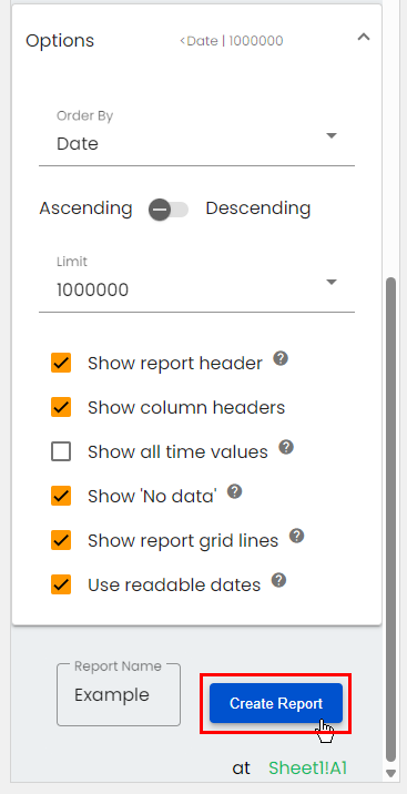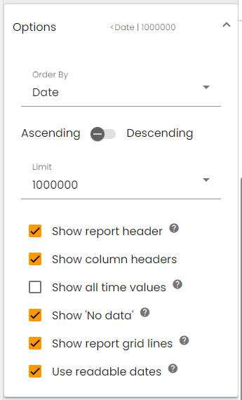 Next, set how the data should be ordered and select the row limit. If you want to report as much data as possible, select the largest value in the "Limit" list: