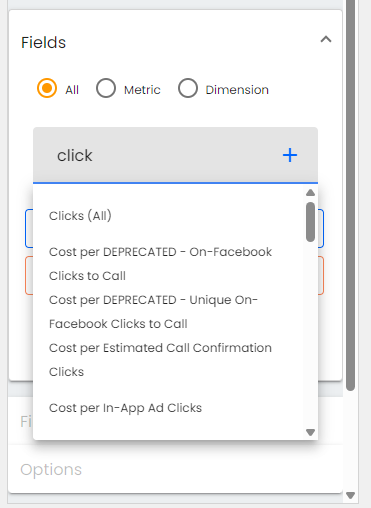 Select the fields you would like to report. You can click the "+" icon to browse them all or type in the box to search for the fields: