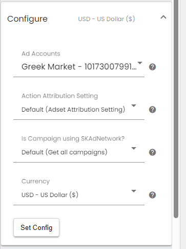 Additional configuration settings will be selected in the next step. If you selected certain data sources, the actual Account, Page, Instance, etc. will be selected in this step: