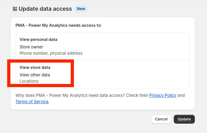 The POS Location Name field requires a specific permission called the read_locations scope to display data in your reports. This scope is enabled by the View store data permission in Shopify. This means: