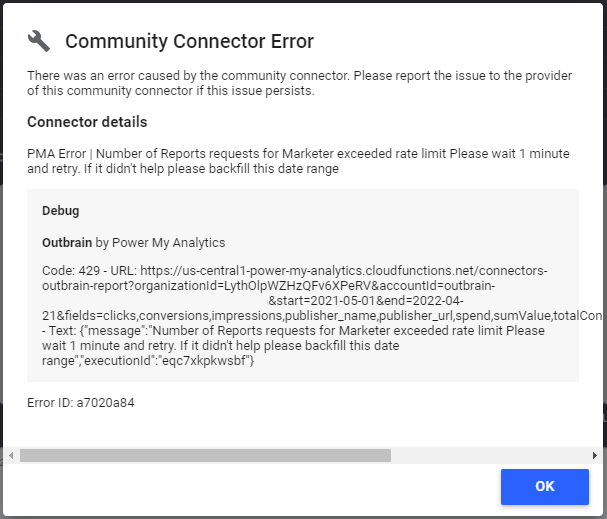 - Live request limit: Outbrain's API has a limit of 10 live requests per minute. If you exceed this limit, such as when first connecting or requesting a long date range, you may receive the error “Number of Reports request for Marketer exceeded rate limit”. Wait one minute and then refresh your data.