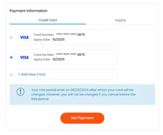 A payment method is not required during the free 14-day trial period. However, we recommend adding a payment method before the trial ends to avoid interruption of your reports. Your payment will not be processed until the trial period ends. We accept ...