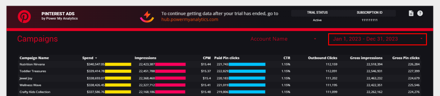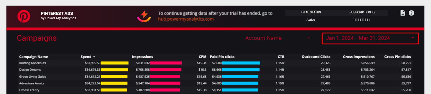 Pinterest's API does not supply accurate data for time periods longer than 185 days, so the number that appears will be a sum of multiple requests.