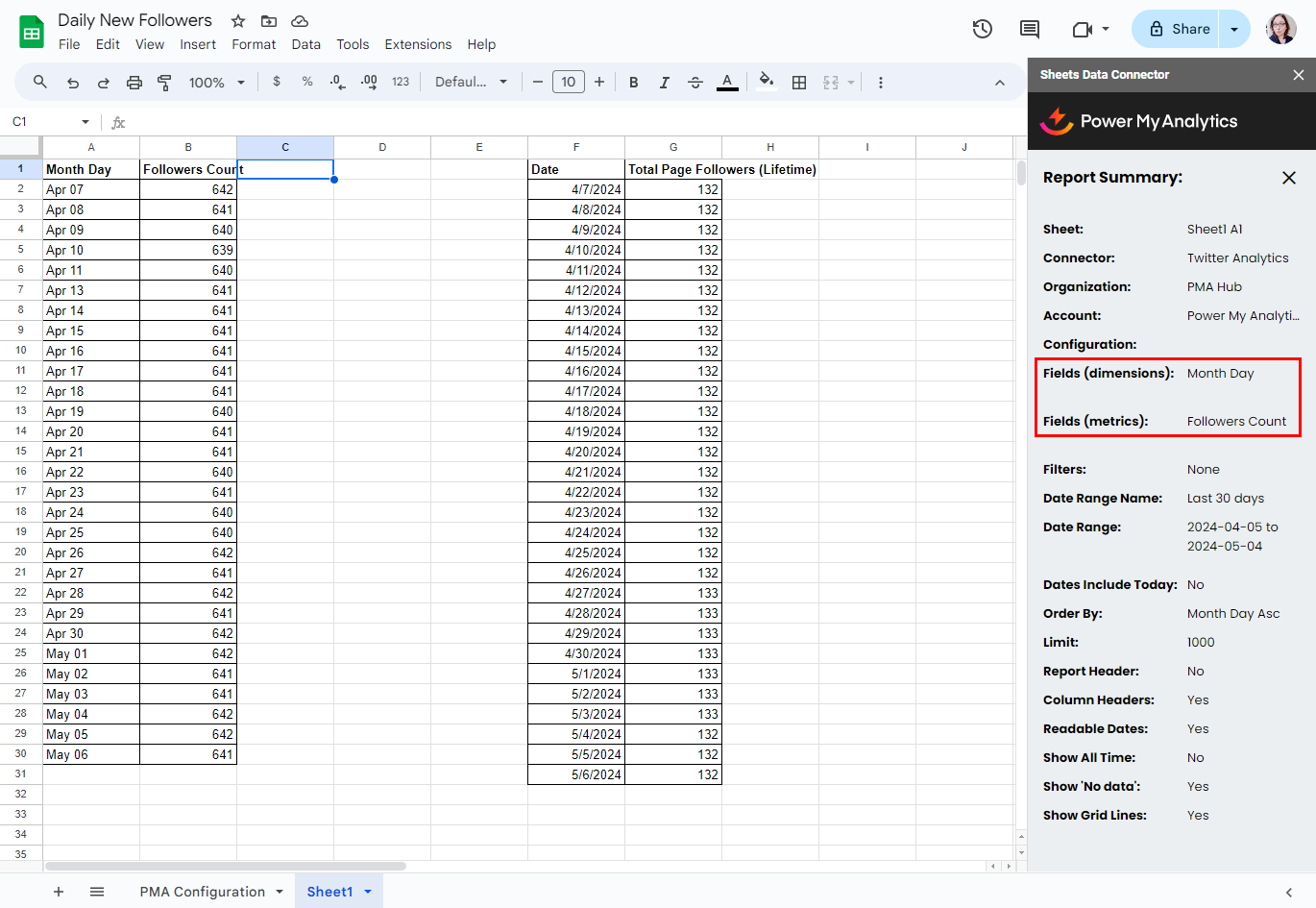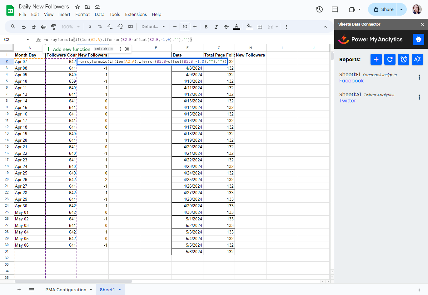 Reporting daily new followers in these social media platforms is important for understanding the success of the account, but the APIs do not provide this information. Luckily, it is possible to calculate using our Google Sheets add-on. Follow the instructions in this article to learn how.