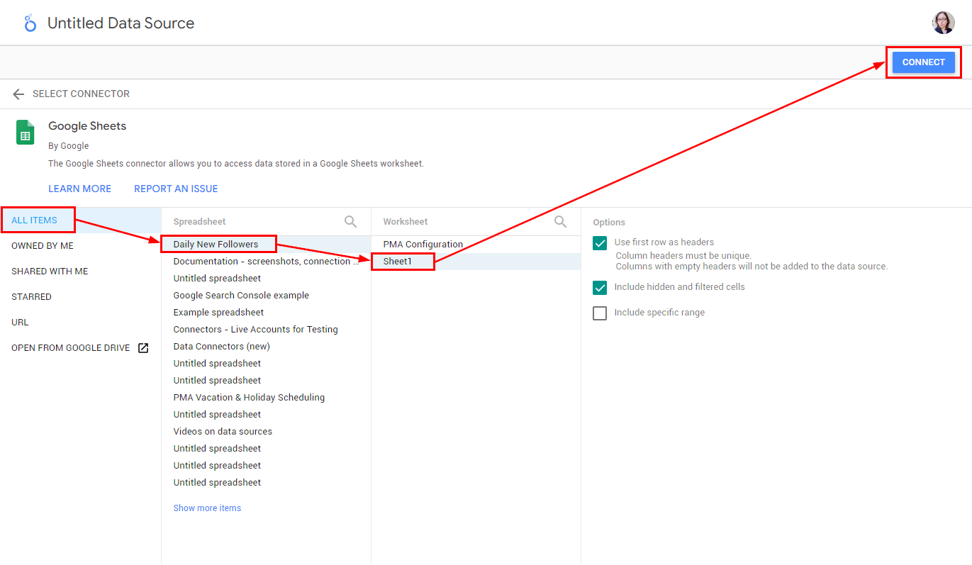 Select the spreadsheet that you created along with the appropriate page and click Connect.