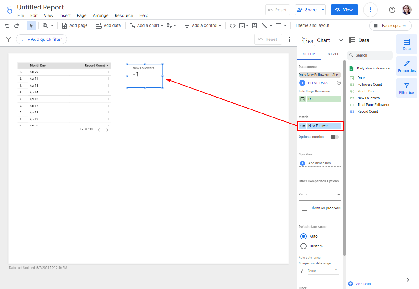 In Twitter, choose Followers Count for your metric and Month Day for your dimension.