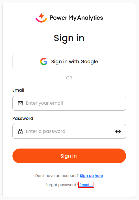 Important: Password reset for your PMA account is only available for accounts that have registered with an email address and password. If you have registered your PMA account with "Sign in with Google" using a Gmail or Google Workspace account, you will not be able to recover your Google account password using this process. For help recovering your Google account, please see How to recover your Google Account or Gmail.On the "Sign in" page, click the "Reset it" link at the bottom of the page.