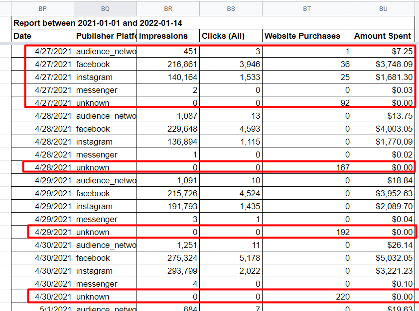 Reports that include breakdowns by publisher platform show "unknown" or zeroes after April 27, 2021.