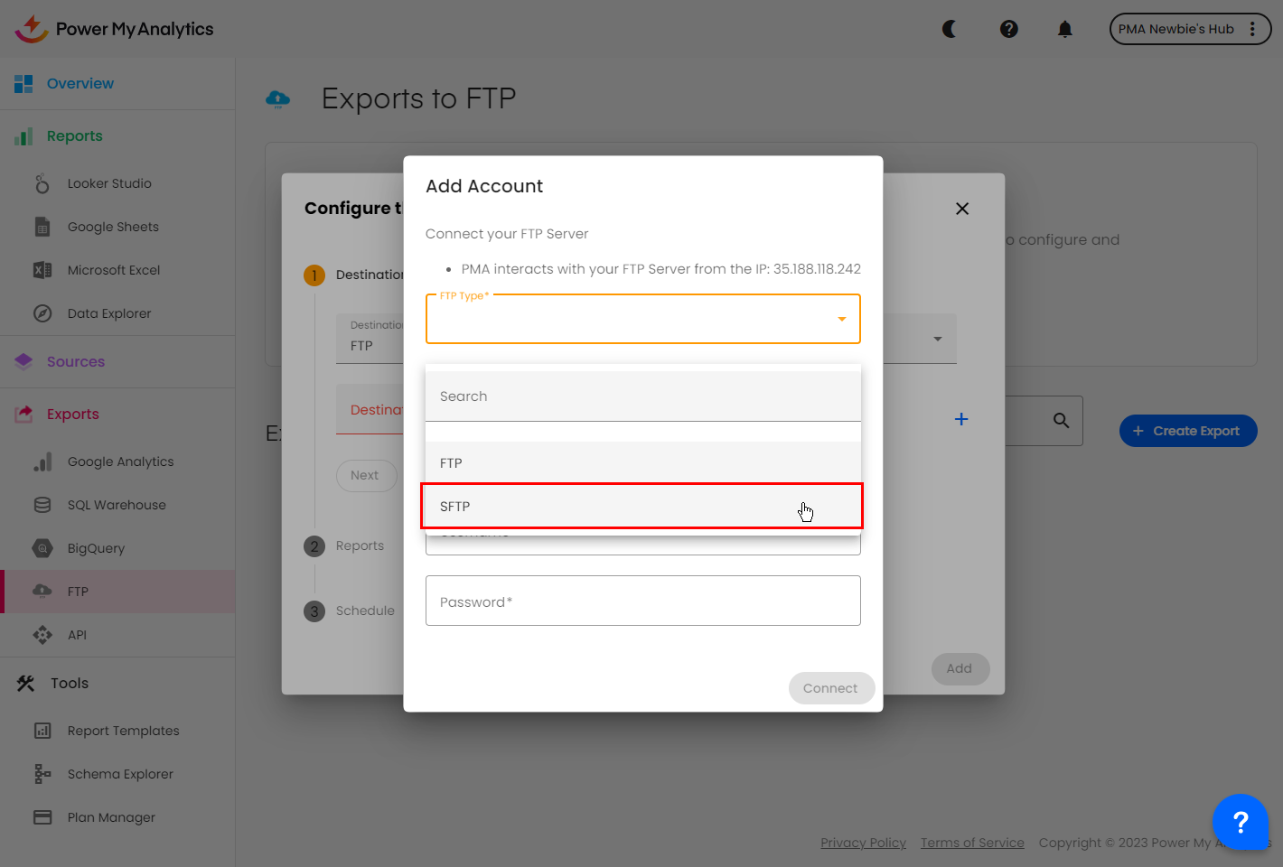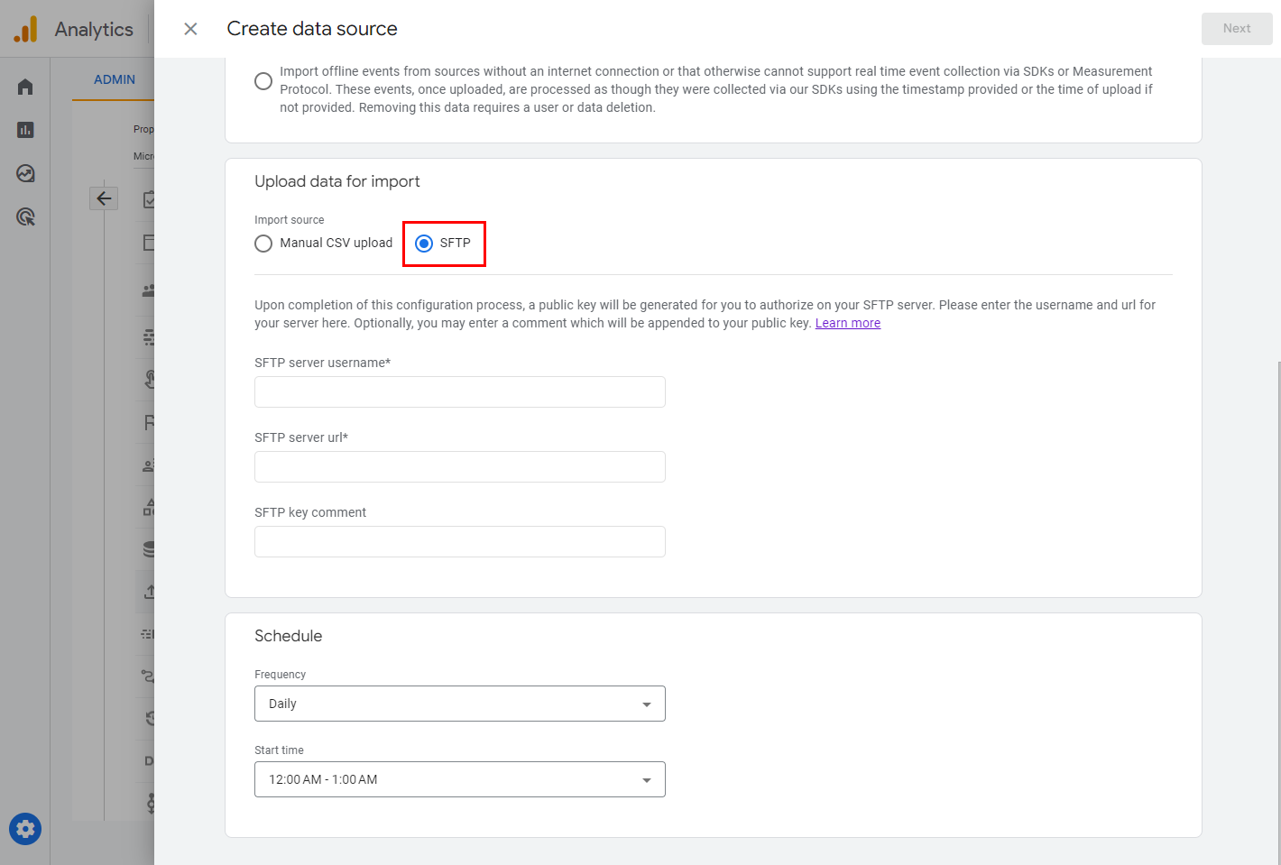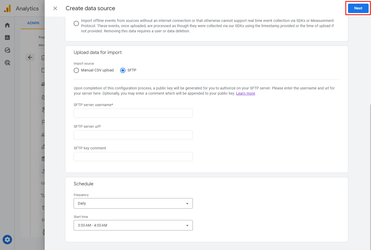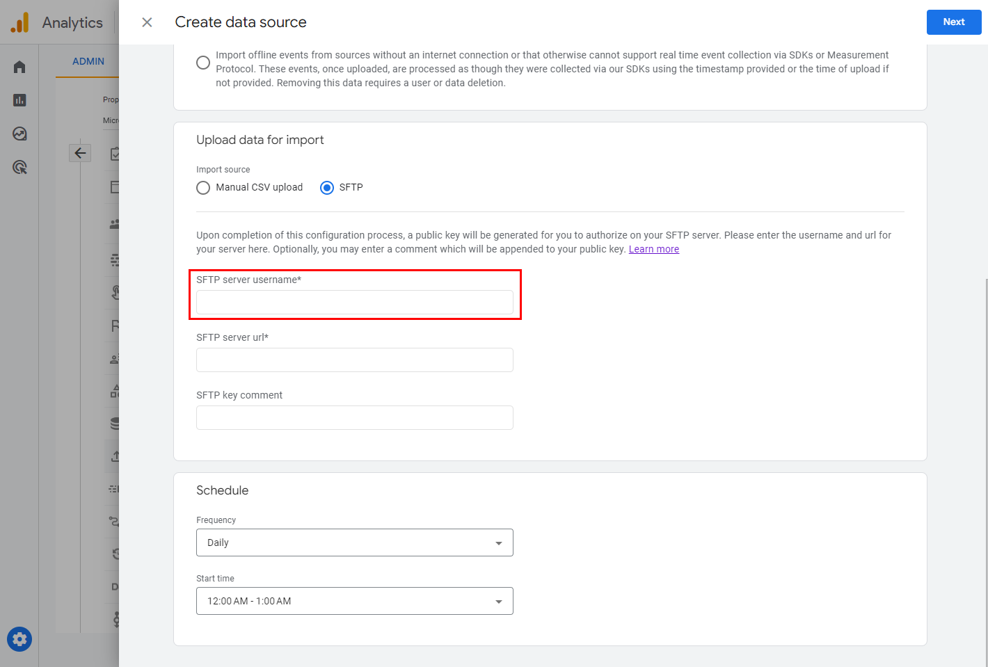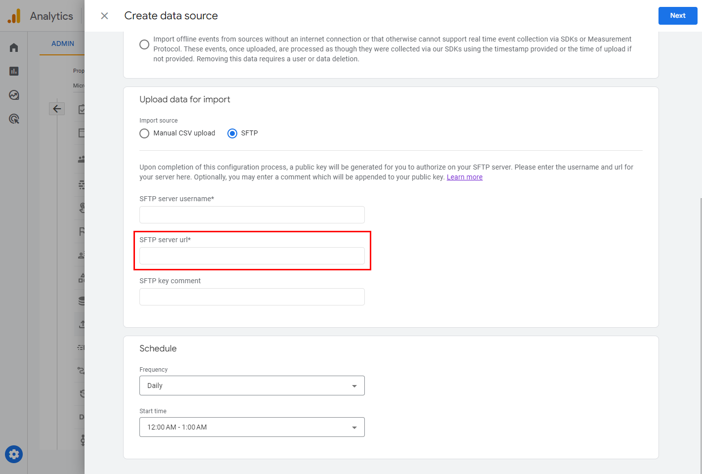 Make sure you know the path and filename for the export on your FTP server. If your sftp protocol URL is not formatted correctly, GA4's import will fail.