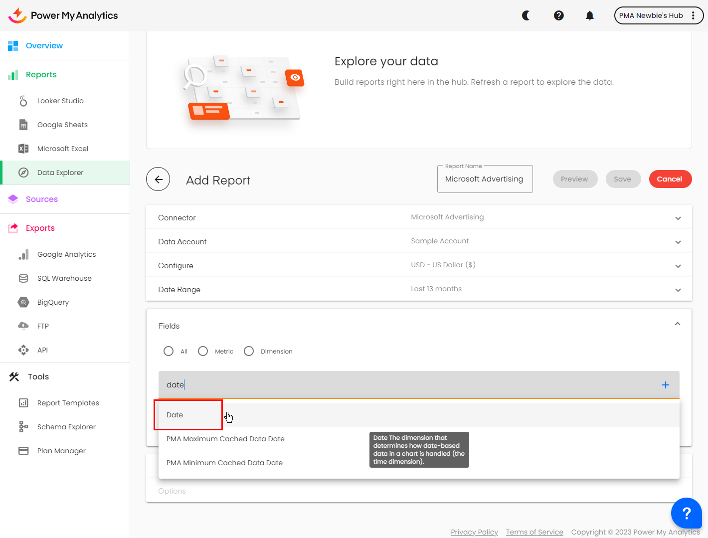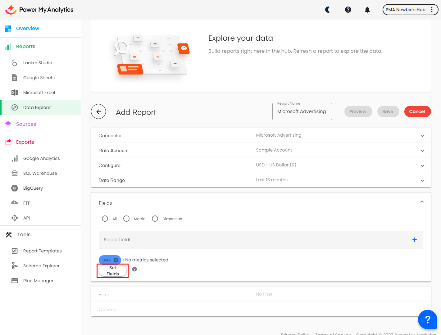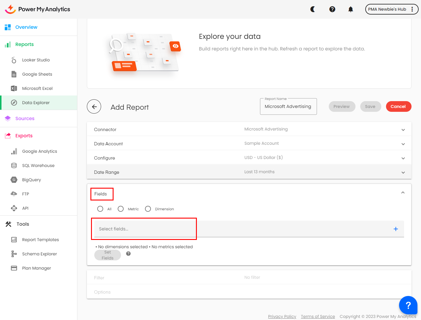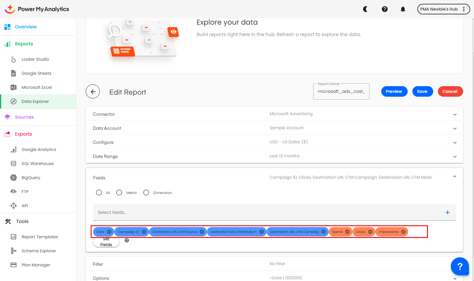 When you’re setting up a report for cost imports, you don’t need to know the exact fields for your connector. PMA will set those up for you in the next step automatically.