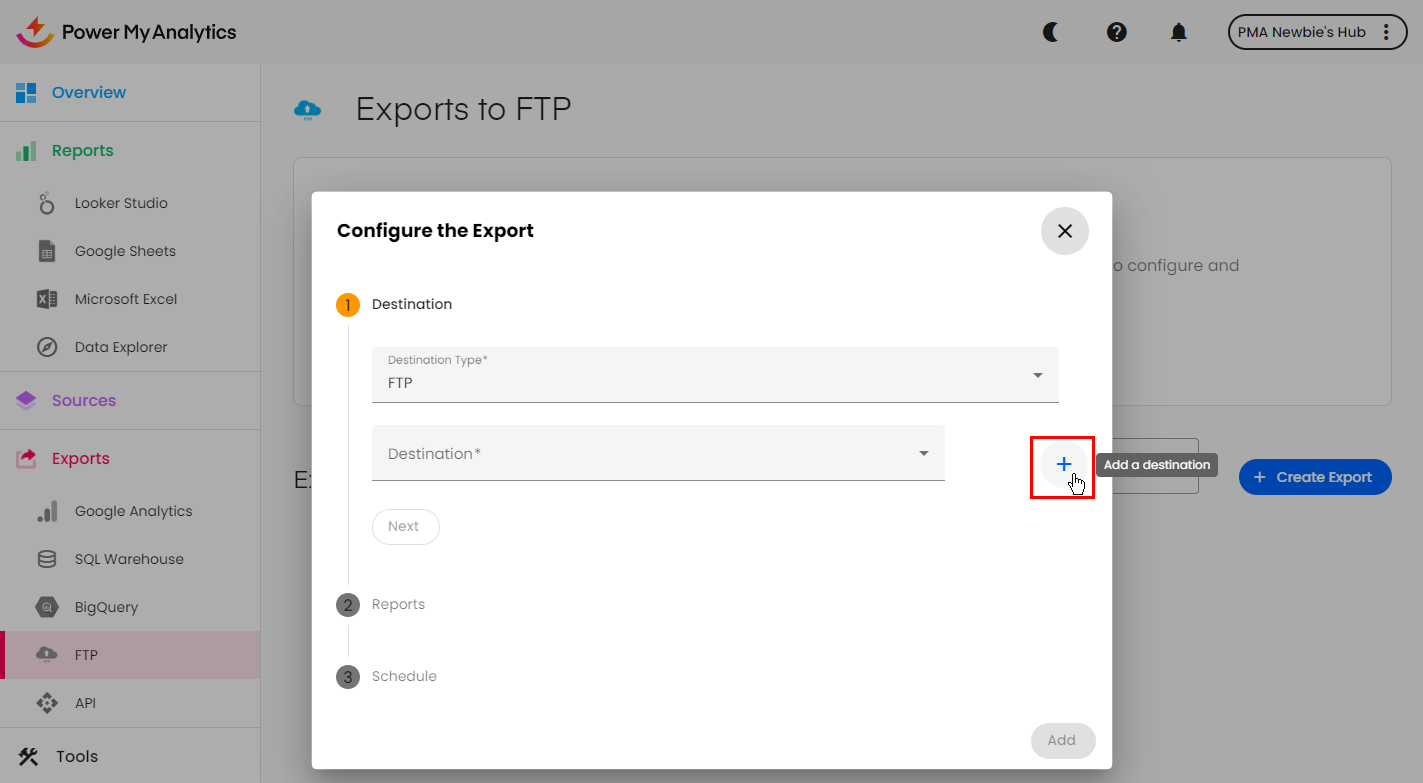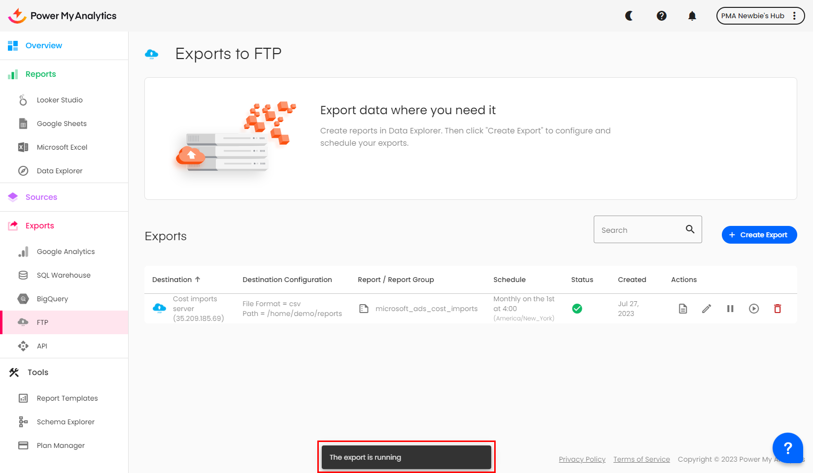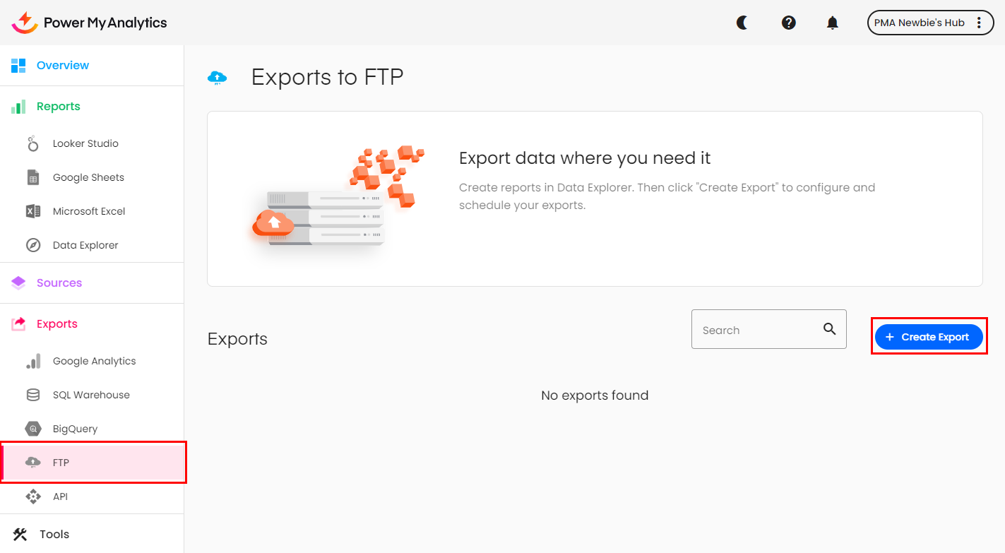 In your hub under Exports, click on FTP. Click on the + Create Export button.
