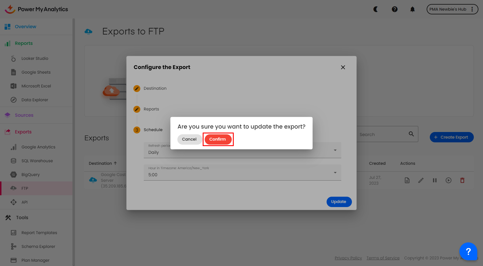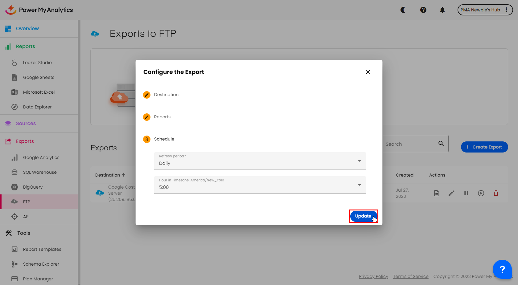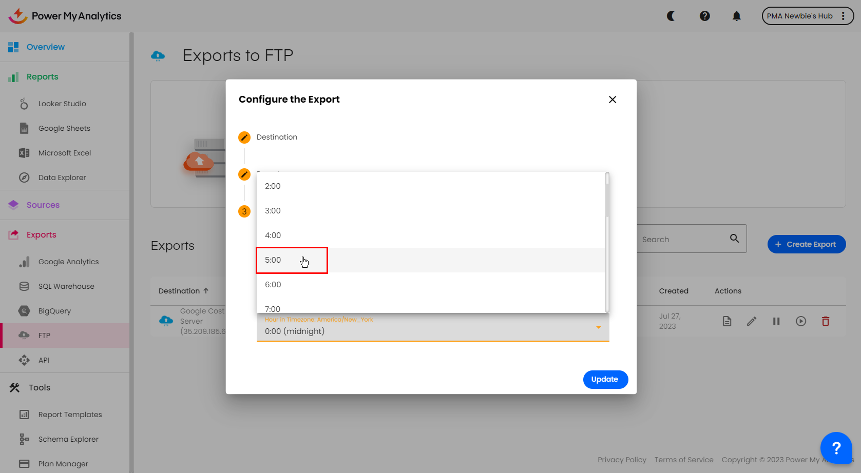 Keep Hour on the previous setting to make sure the FTP export will finish running every day before GA4 retrieves this data. Then click the blue Update button.