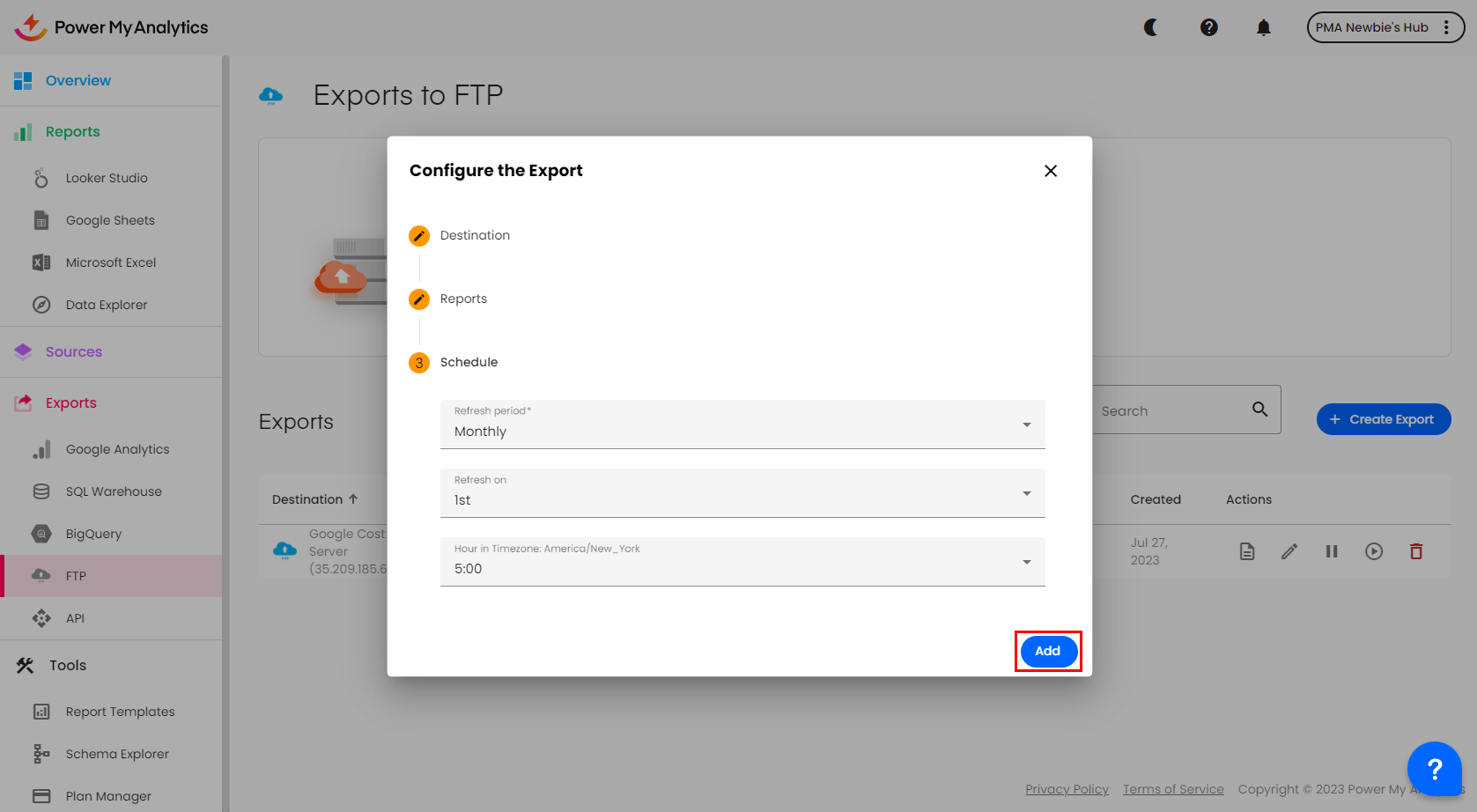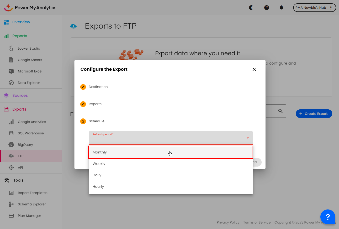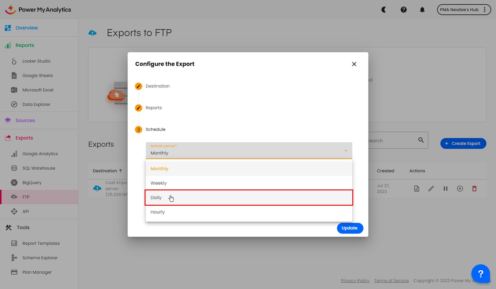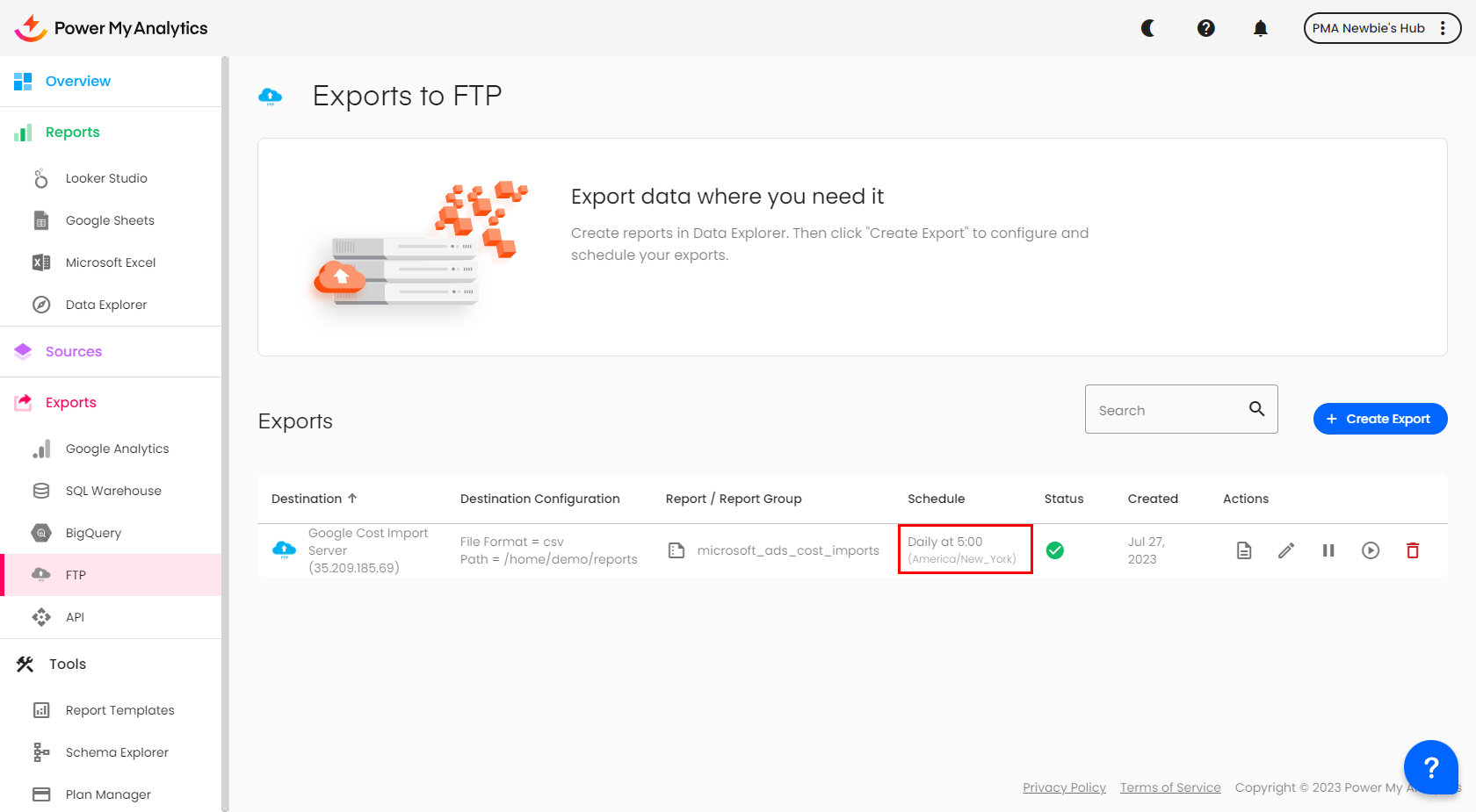 Now that your historical data is imported, you can go back to your Power My Analytics hub and set up a daily refresh of your cost data. This will keep your GA4 cost import data updated every day with new data from your FTP export.