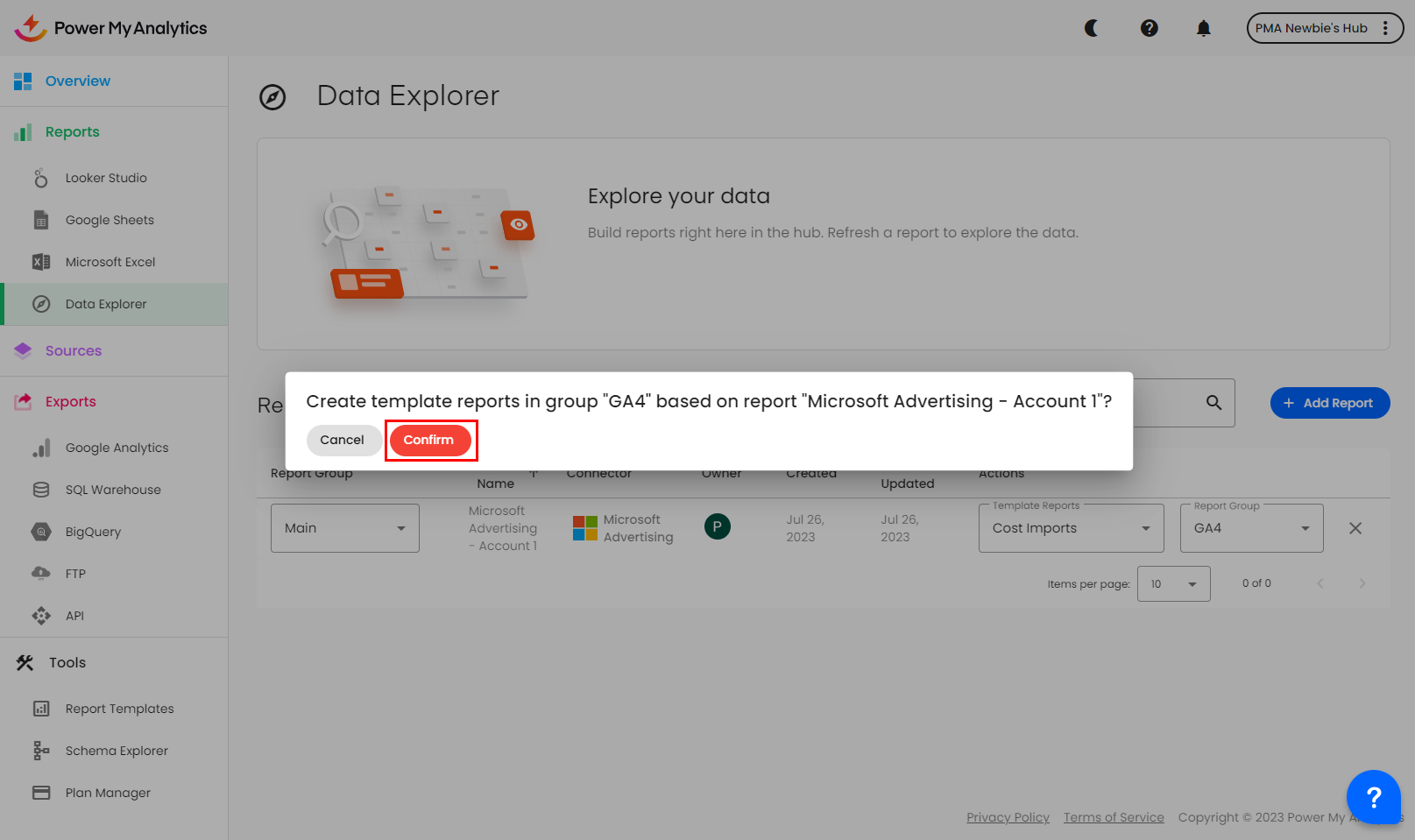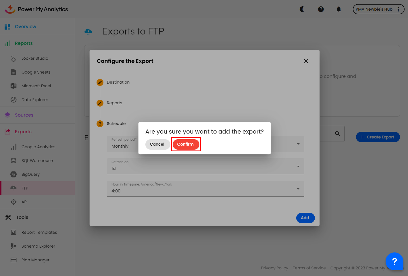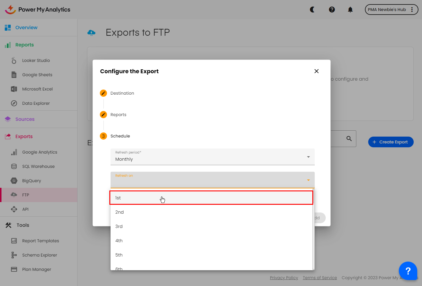 Now that your historical data is imported, you can go back to your Power My Analytics hub and set up a daily refresh of your cost data. This will keep your GA4 cost import data updated every day with new data from your FTP export.