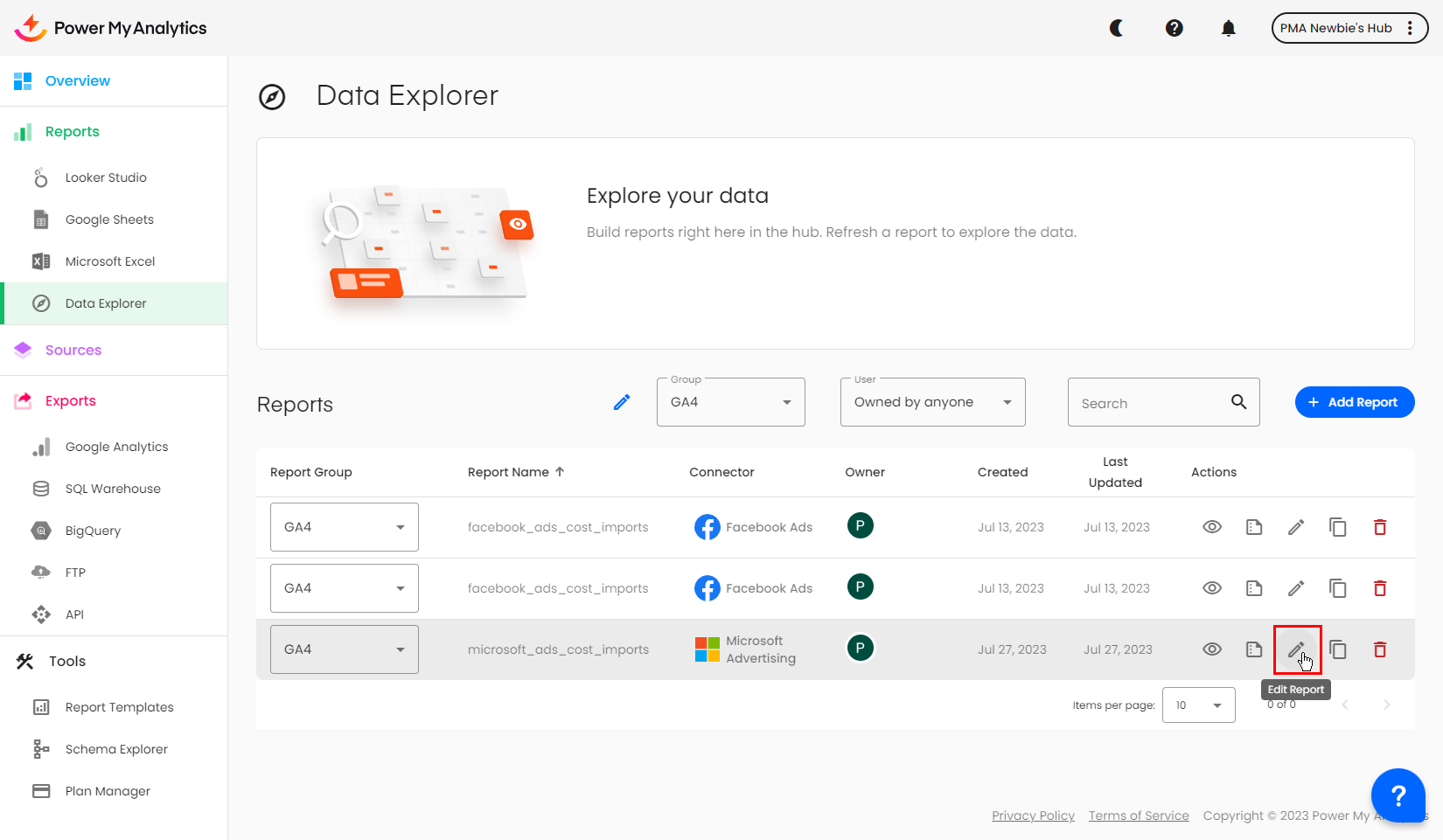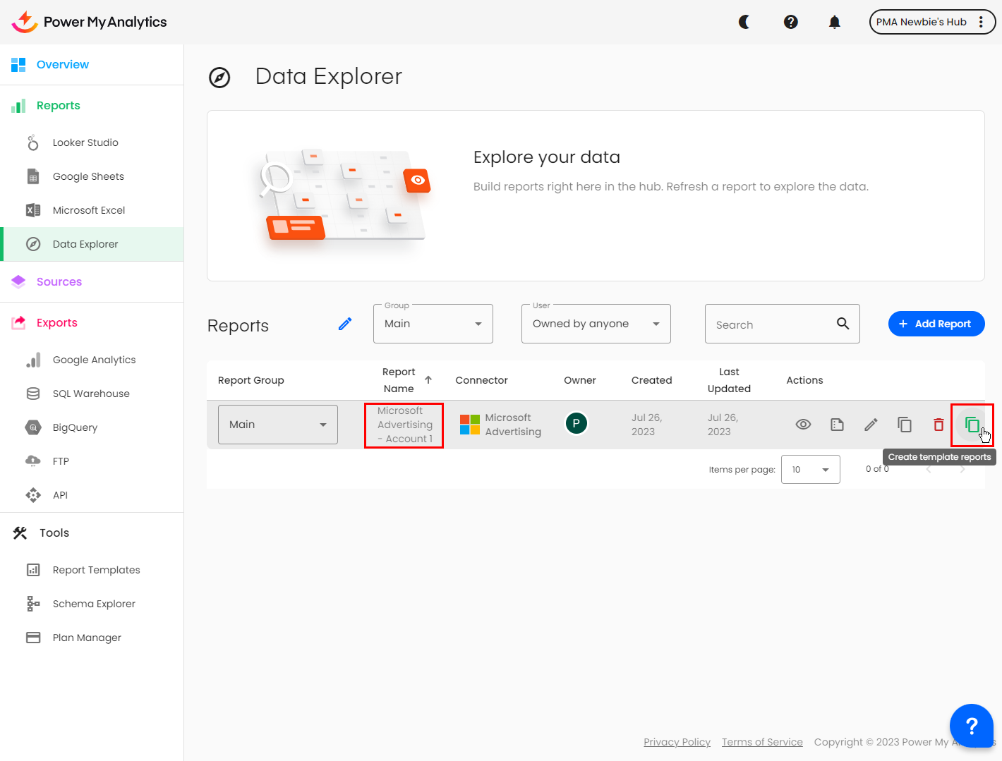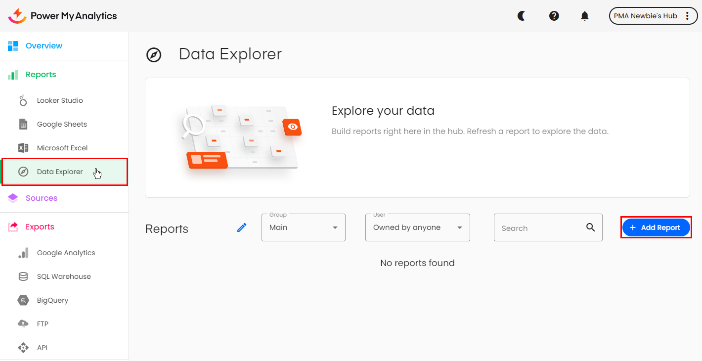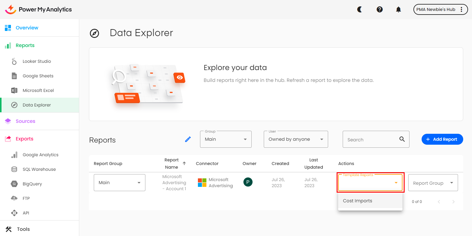 Start at hub.powermyanalytics.com. Under Reports, go to Data Explorer. Then click + Add Report to start creating the template report.