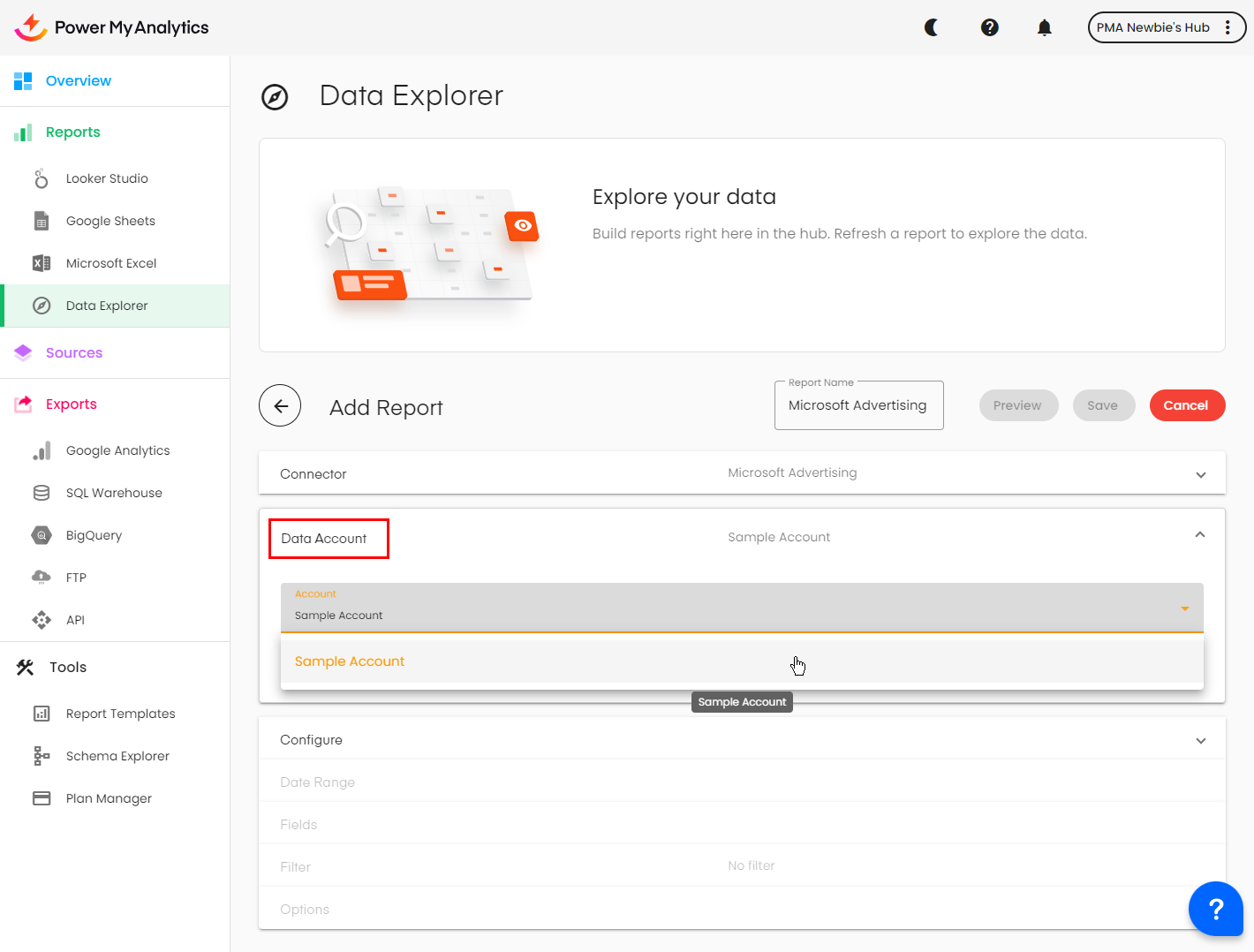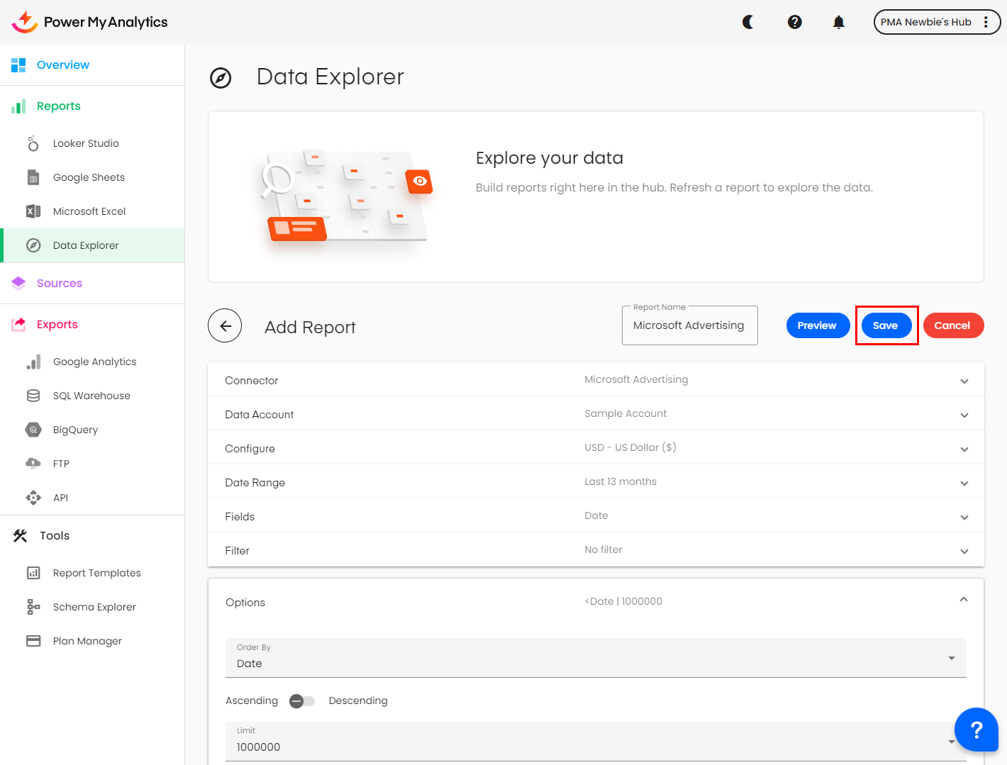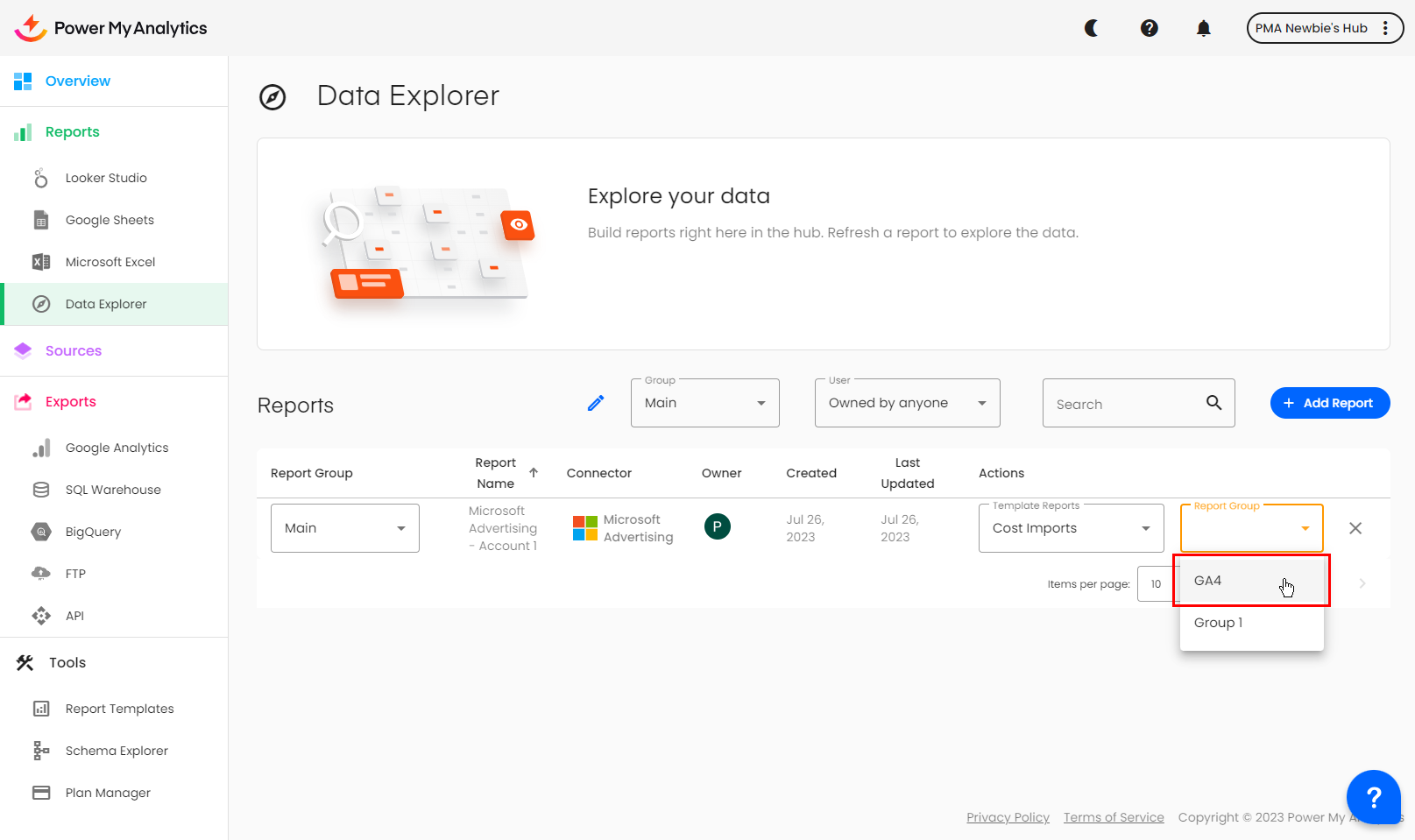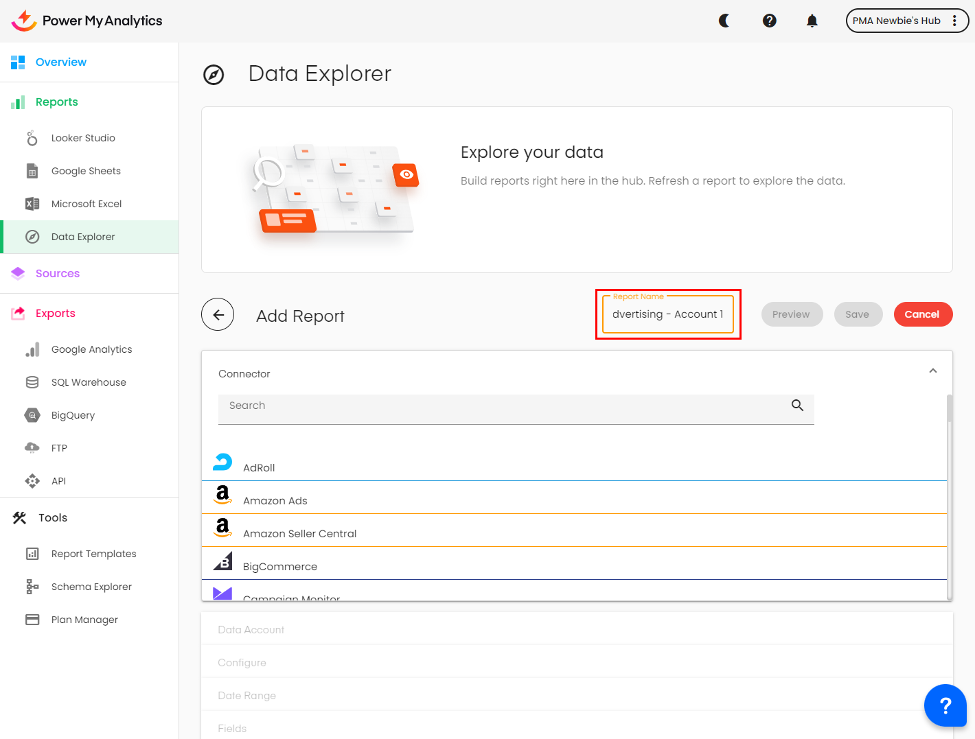 Start at hub.powermyanalytics.com. Under Reports, go to Data Explorer. Then click + Add Report to start creating the template report.