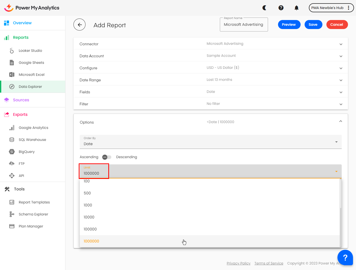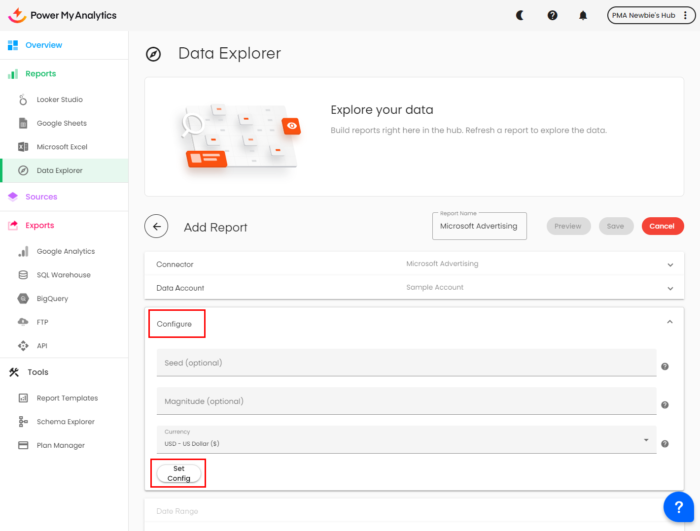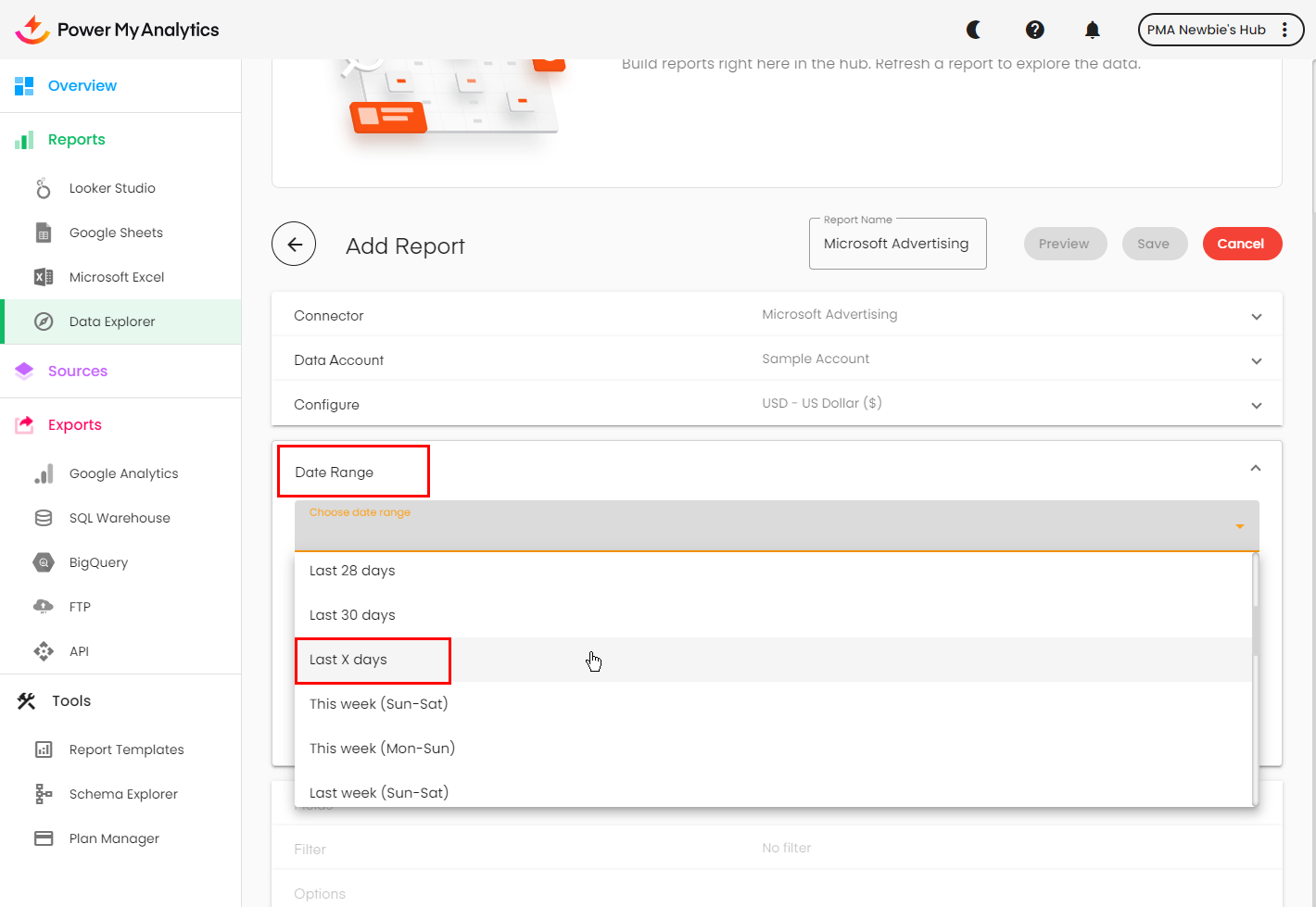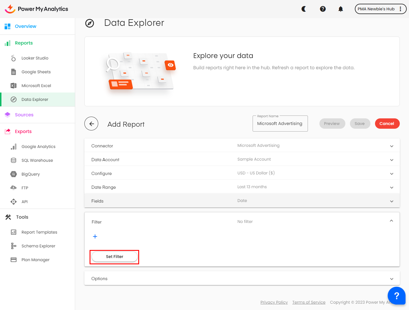 Start at hub.powermyanalytics.com. Under Reports, go to Data Explorer. Then click + Add Report to start creating the template report.
