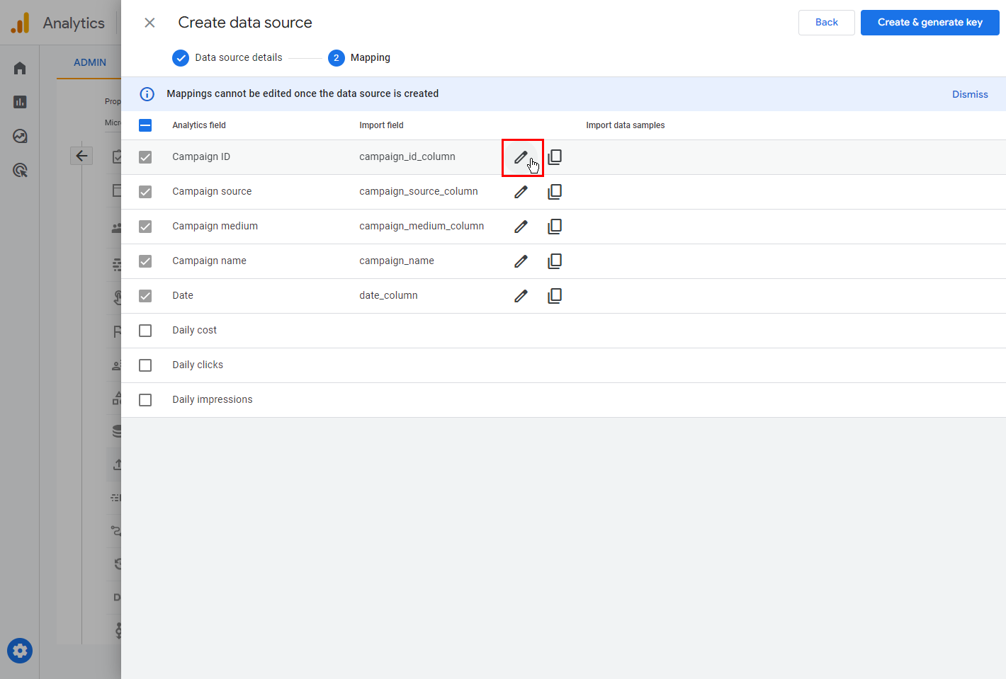 Now you can set up the field mapping for your cost data imports. Under Import field for each row, click the pencil icon and enter the column names for: