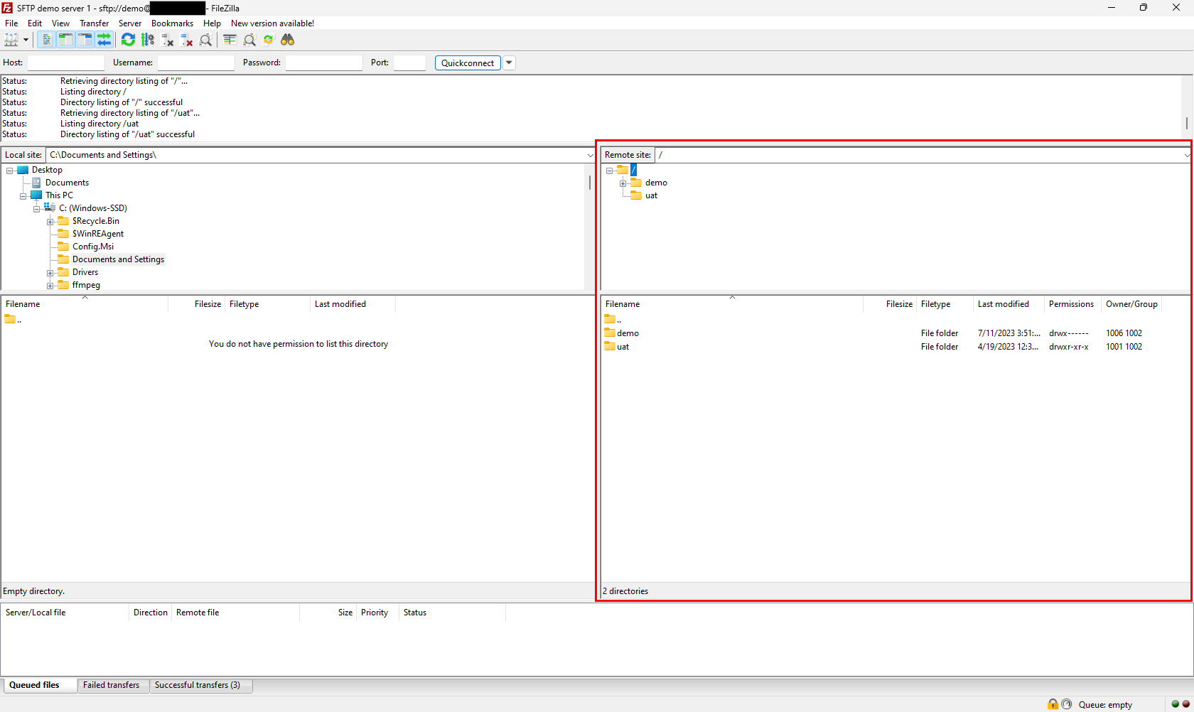 FileZilla's instructions to log in to your server with your FTP hostname, username and password. The root directory of your FTP server will appear in the right panel.