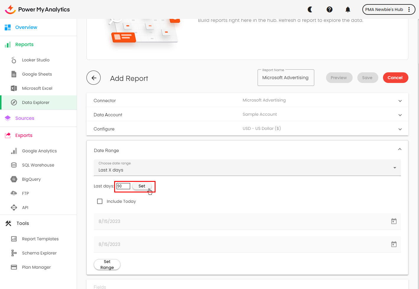 Under Date Range, select the timespan of historical data you'd like to backfill. In this example, we’ll select the last 90 days of data.