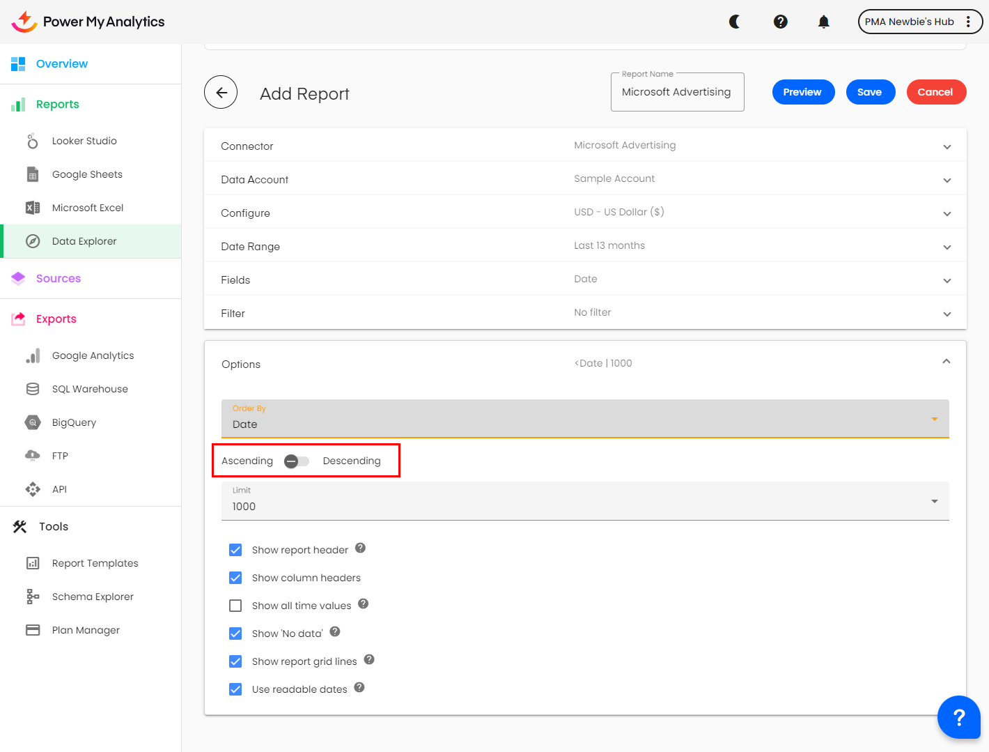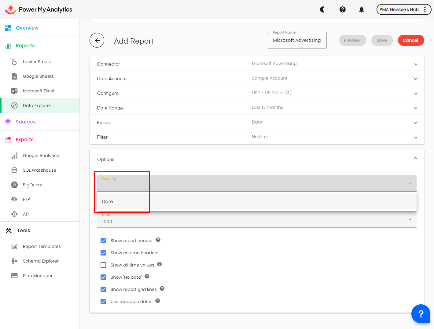 Under Options, select a field to Order By, and choose an ascending or descending order. In this example, we’ll sort by date in ascending order.