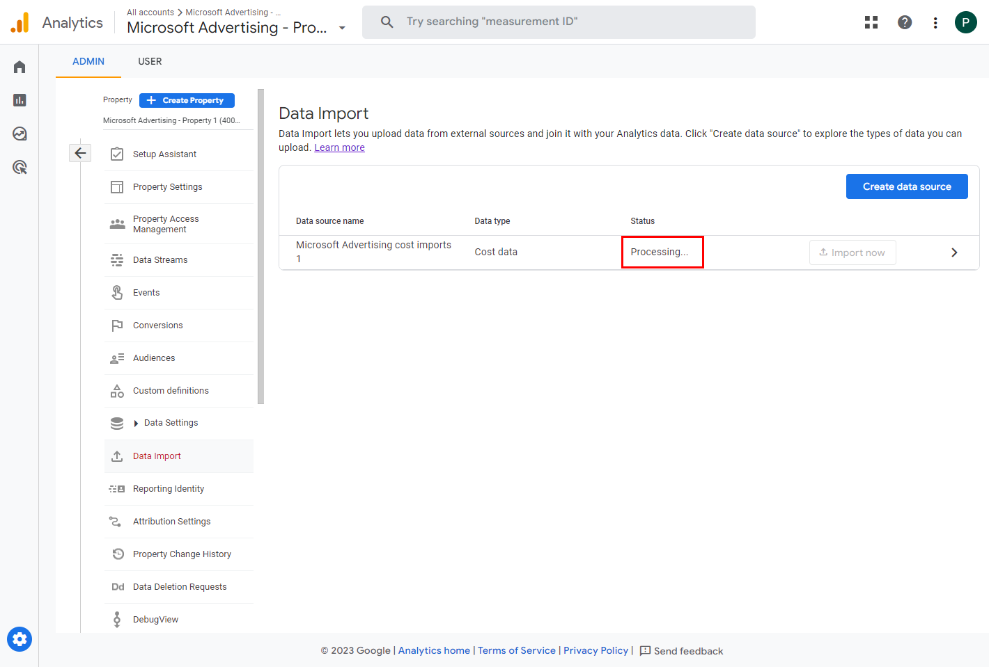 At this time, only one cost data source can be imported to your GA4 property. For example, you can import cost data either from Facebook Ads only or from Microsoft Ads only, but not from both at once. We are currently working on a solution to support multiple cost data imports into GA4 from more than one source.