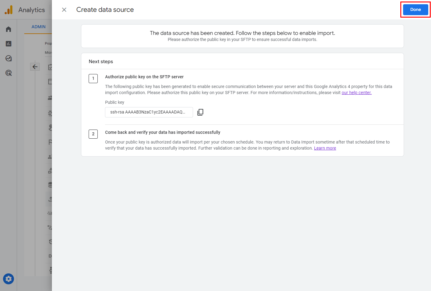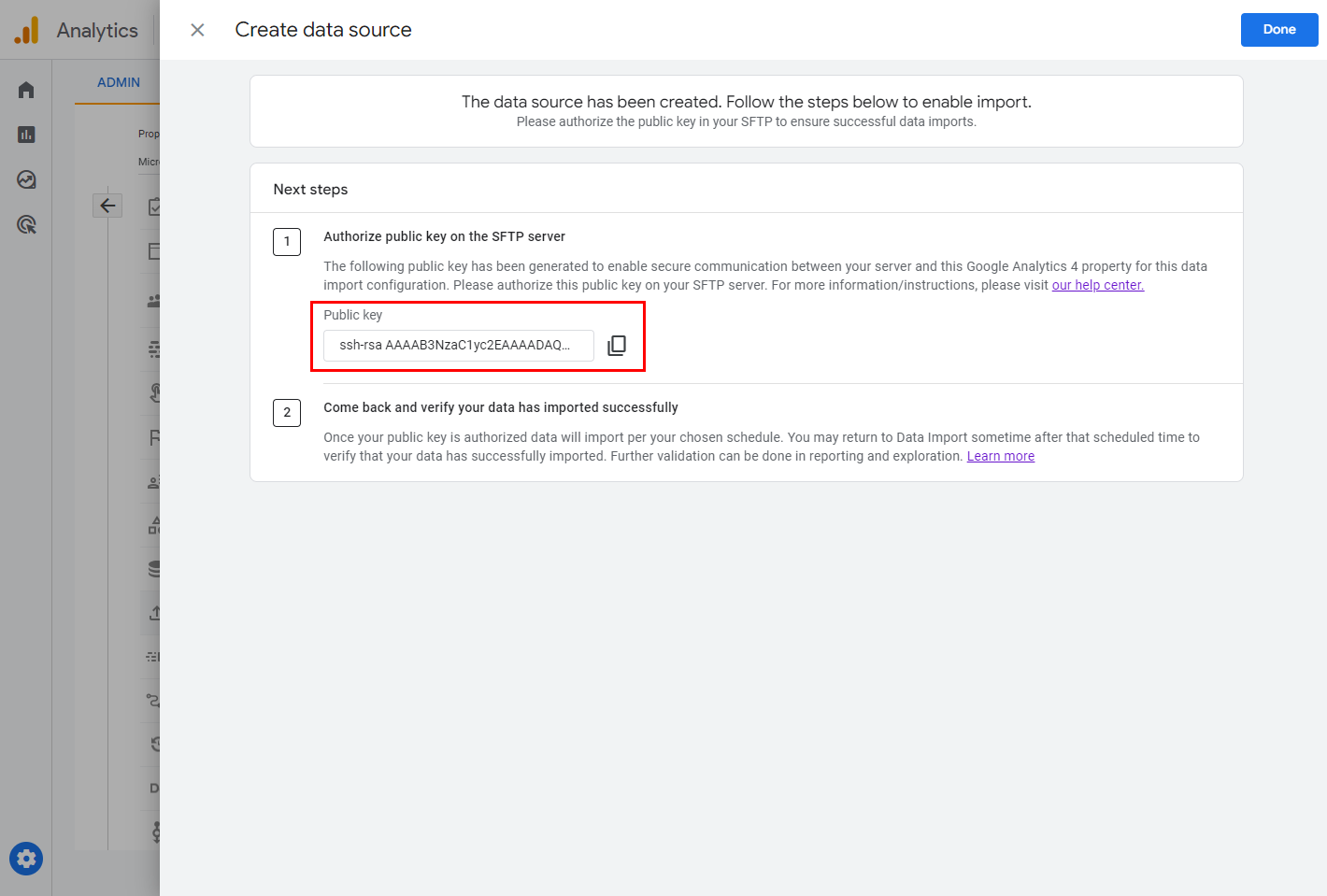 Google Analytics 4 will provide a public key for you to copy and authorize on your FTP server.