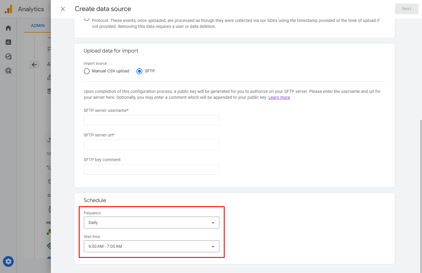 The start time must be at least an hour later than the hour selected for your scheduled FTP export. This will ensure that your cost data has finished exporting to your FTP server by the time GA4 is scheduled to retrieve it.