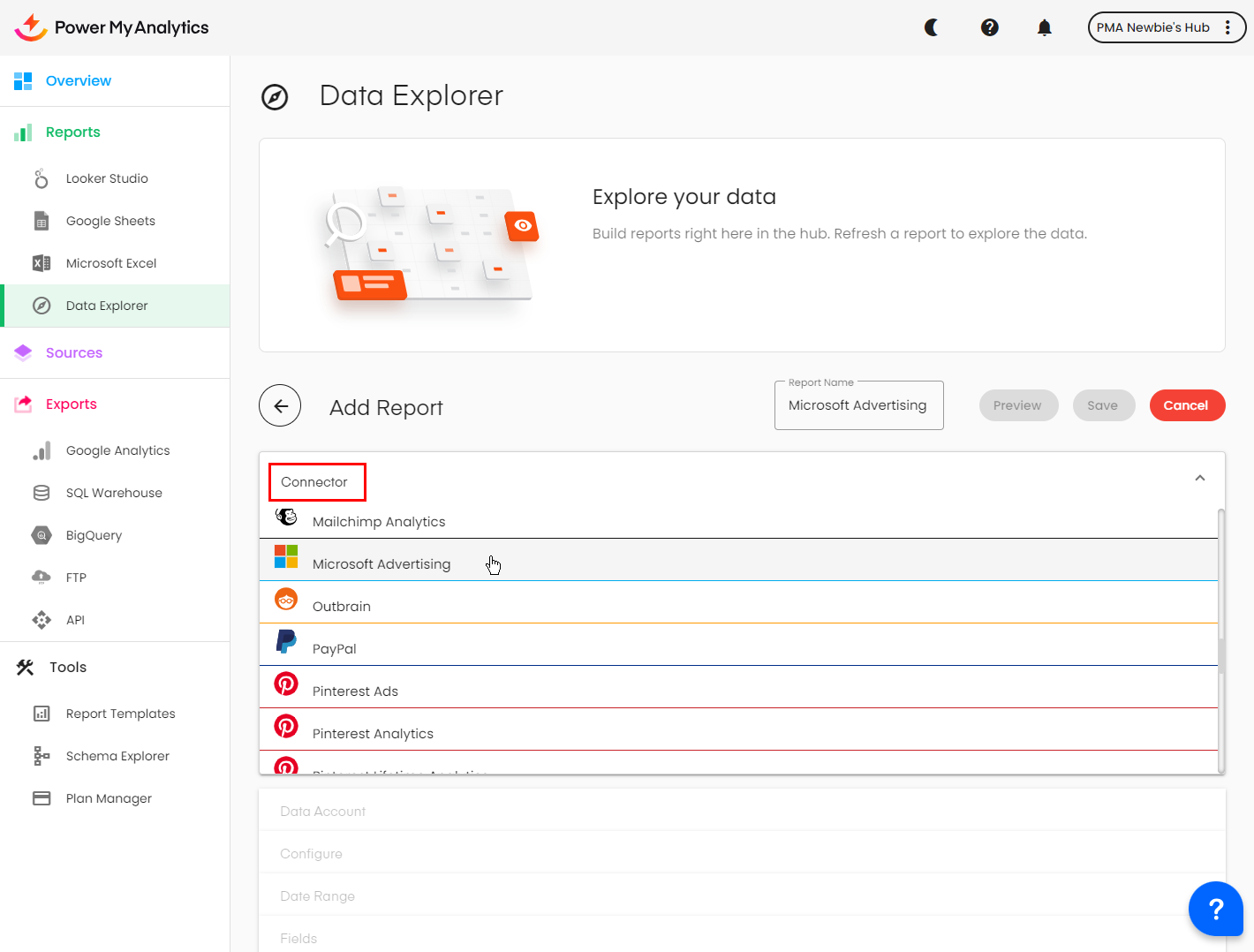 In this example, under Connector, we’ll select Microsoft Advertising.