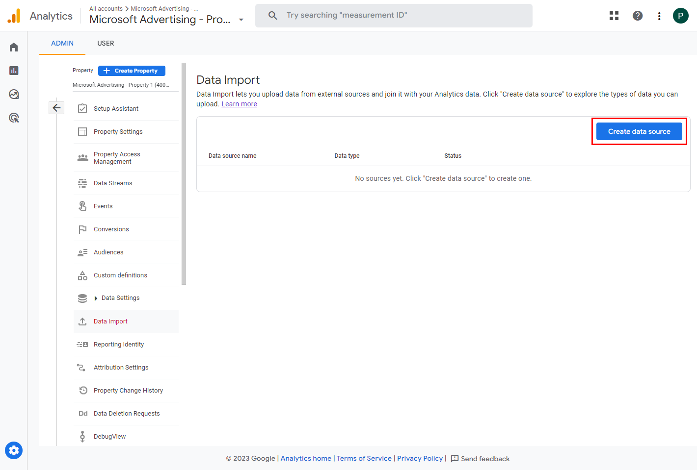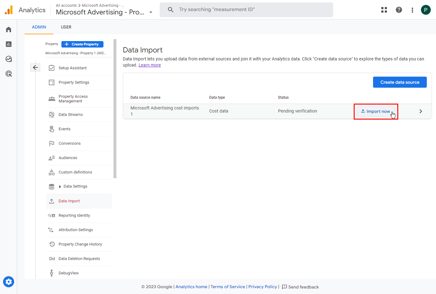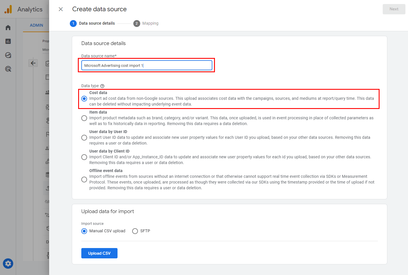 Under Data source name, enter a name for your cost import like "Microsoft Advertising cost import 1". Under Data type, make sure Cost data is selected.