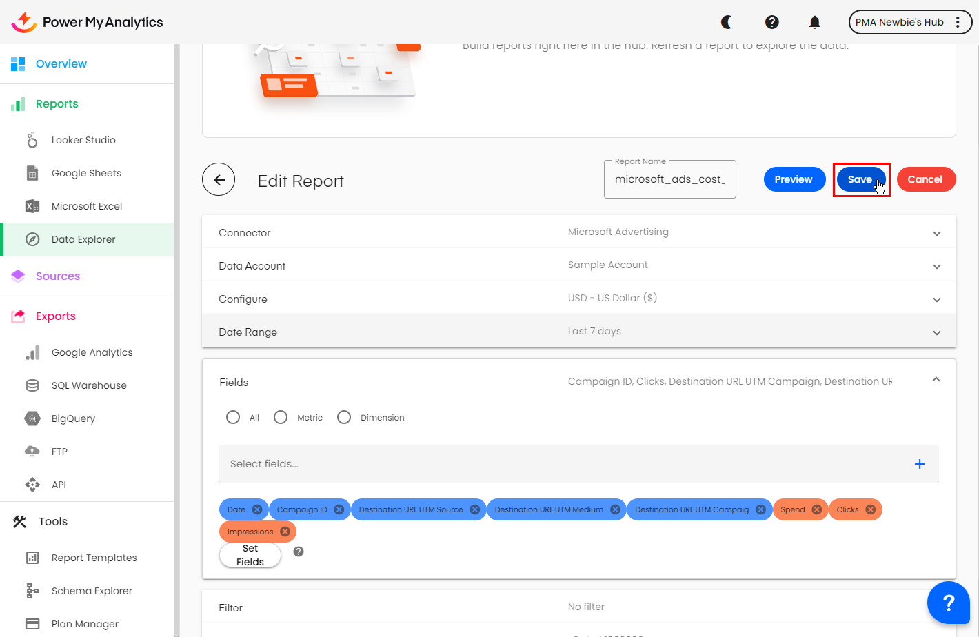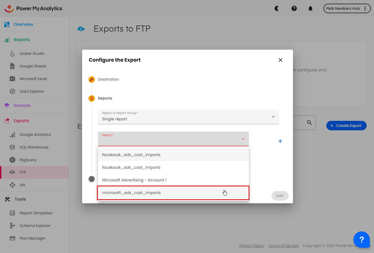 Make sure to remember the name of this report, as you will need it when setting up FTP exports in the next step. This report will automatically be given a name similar in style to microsoft_ads_cost_imports.