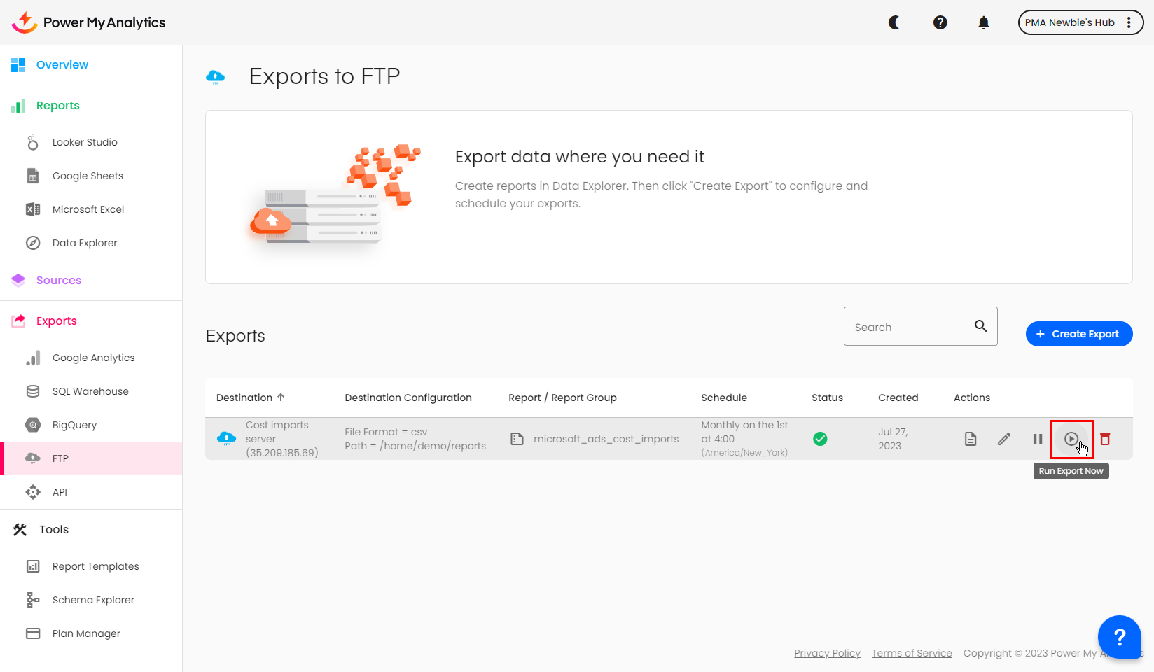 Then find your new export in the list under Exports, and click the play arrow button to run the export now.