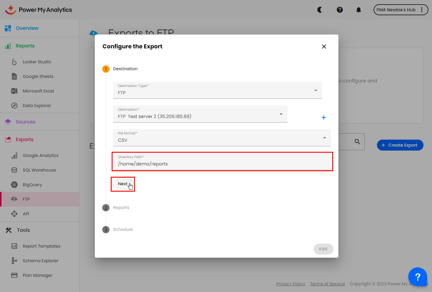 In the Directory path field, enter the path for the directory on your server you’d like to use for your CSV exports. This might be a path like /home/demo/reports. Then click Next.